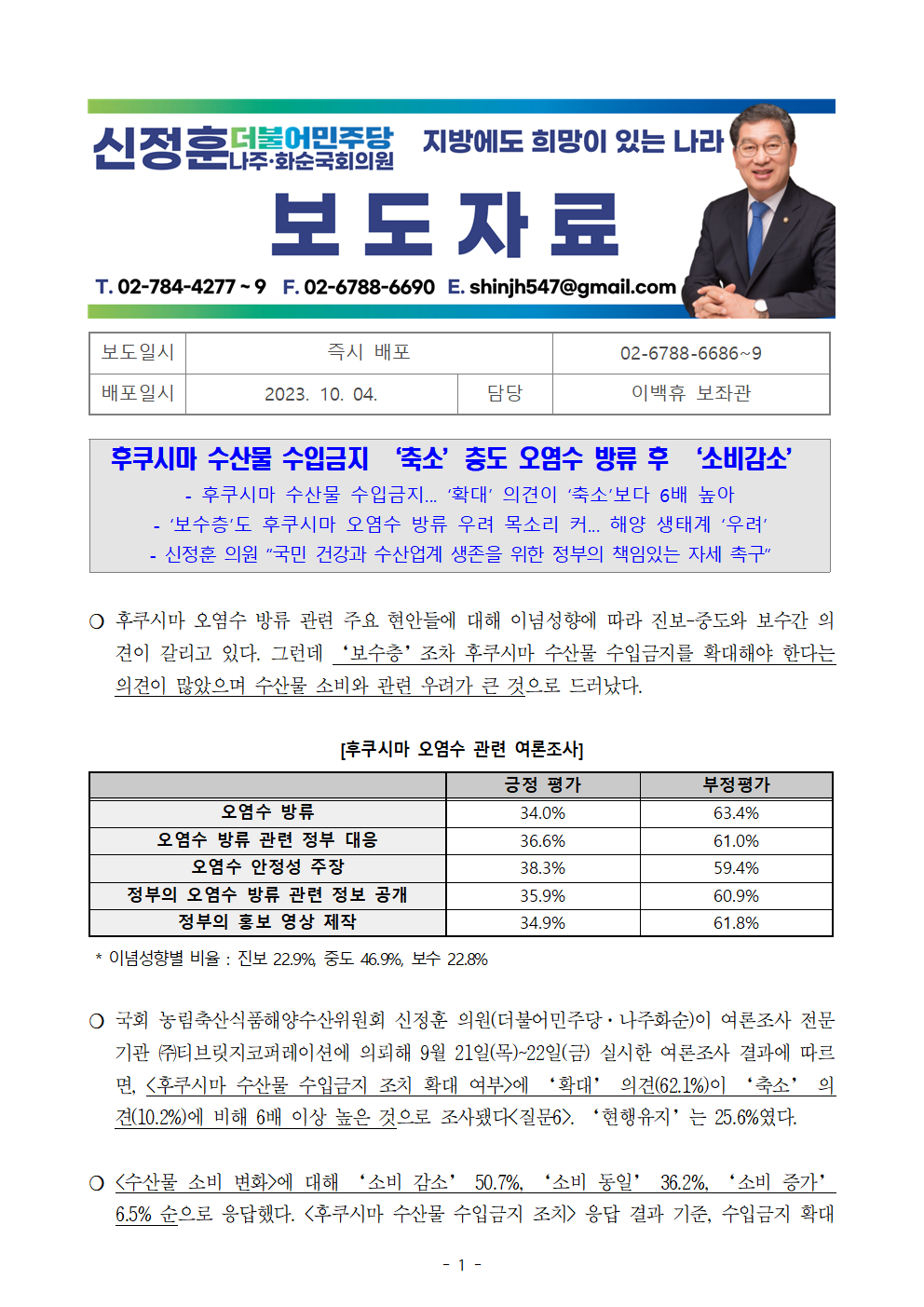 [신정훈 의원 보도자료] 후쿠시마 수산물 수입금지 ‘축소’층도 오염수 방류 후 ‘소비감소’