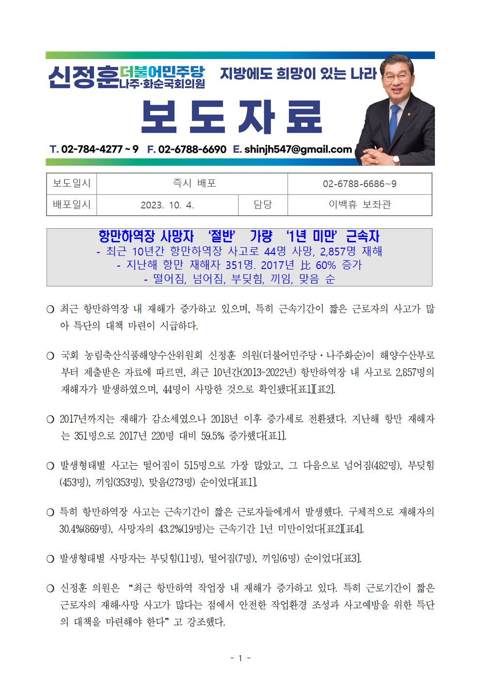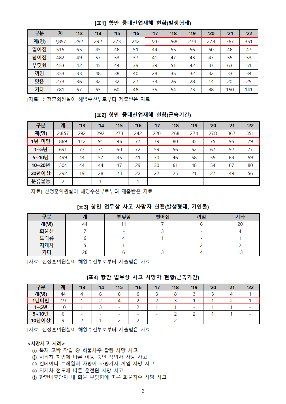 [신정훈 의원 보도자료] 항만하역장 사망자 ‘절반’ 가량 ‘1년 미만’근속자