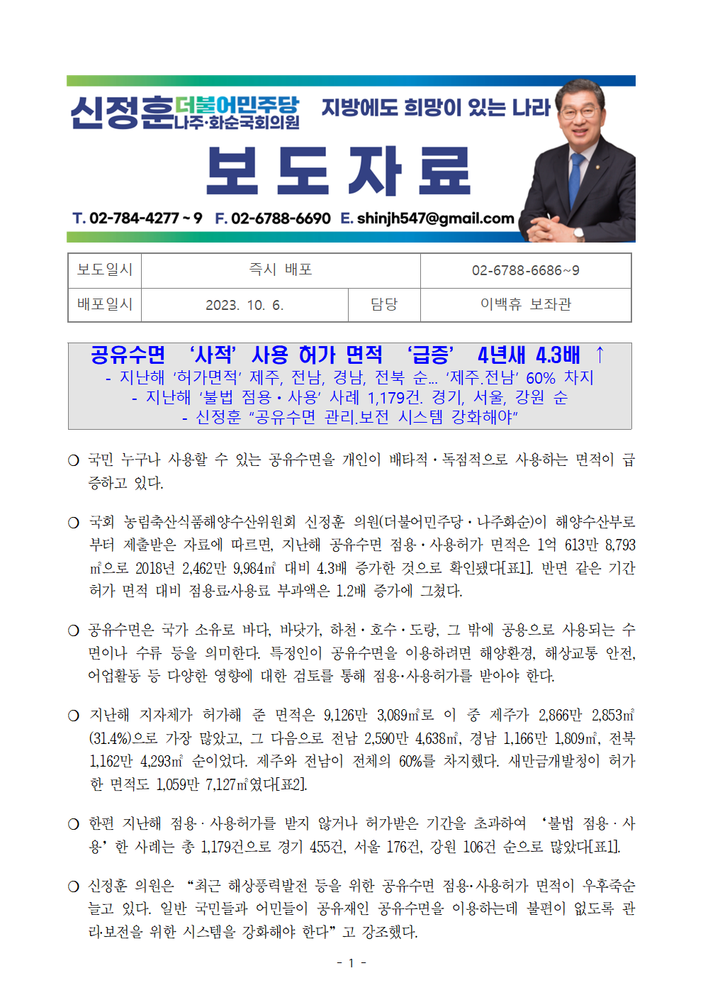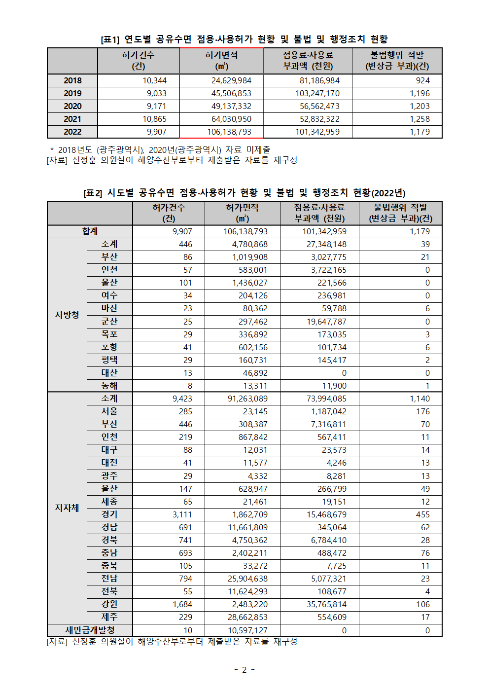 [신정훈 의원 보도자료] 공유수면 ‘사적’사용 허가 면적 ‘급증’ 4년새 4.3배 ↑