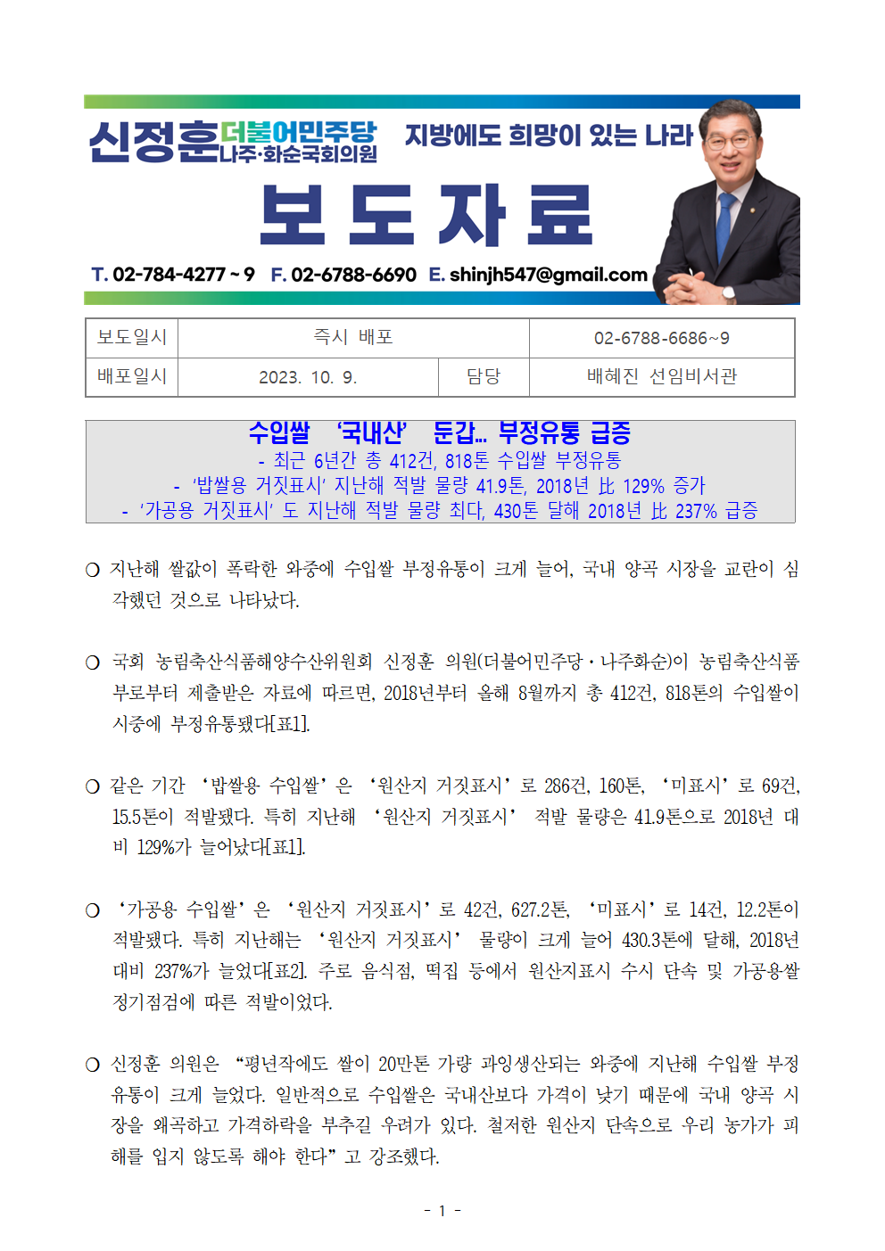 [신정훈 의원 보도자료] 수입쌀 ‘국내산’ 둔갑... 부정유통 급증