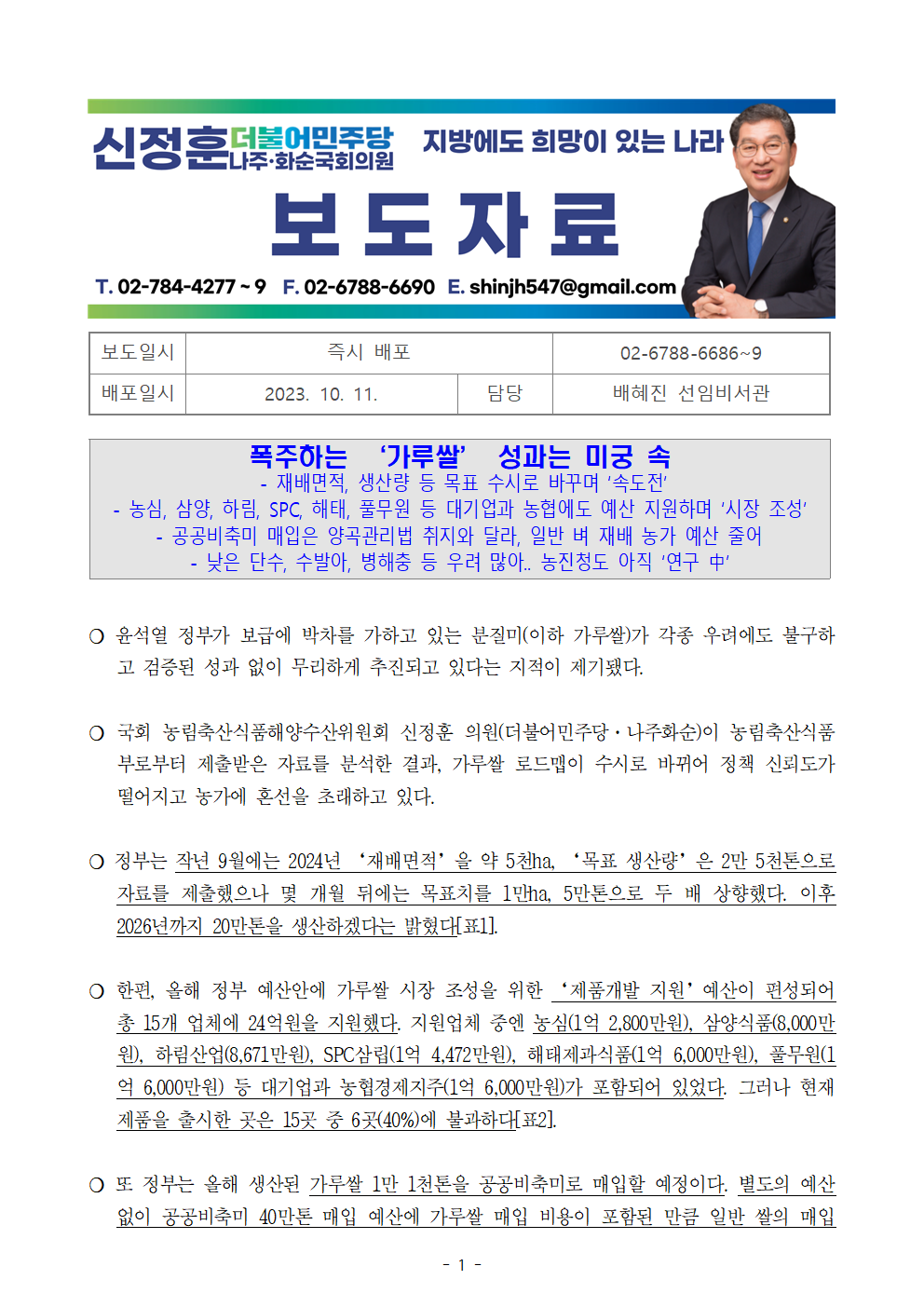 [신정훈 의원 보도자료] 폭주하는 ‘가루쌀’ 성과는 미궁 속