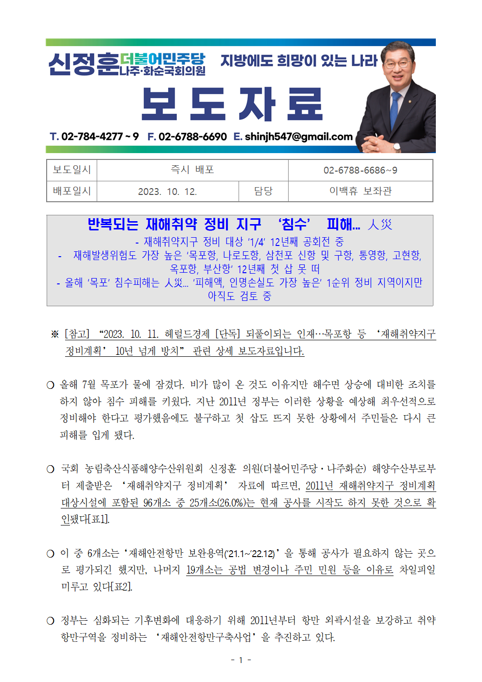 [신정훈 의원 보도자료] 반복되는 재해취약 정비 지구 ‘침수’ 피해... 人災