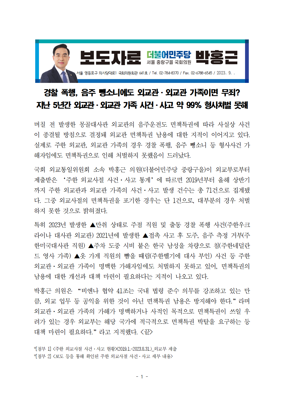 [박홍근의원 국감 보도] 경찰 폭행, 음주 뺑소니에도 외교관·외교관 가족이면 무죄? 지난 5년간 외교관·외교관 가족 사건·사고 약 99% 형사처벌 못해