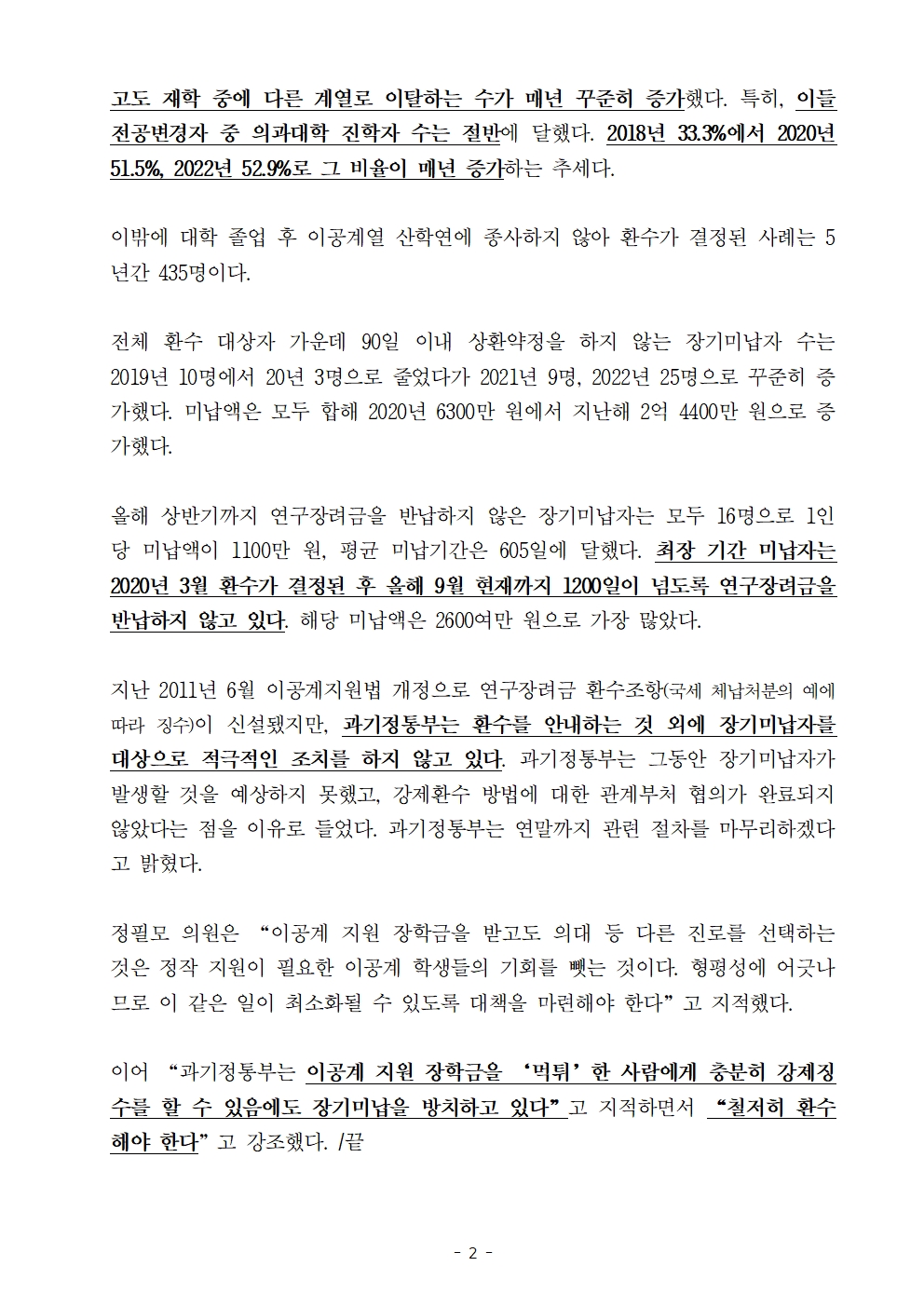 [정필모 의원 보도자료] 이공계 지원 연구장려금‘먹튀’하고 반환 안 한 장학생, 장기미납 최대 1200일!