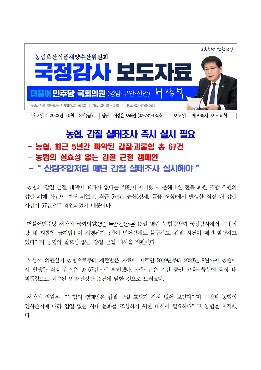 [서삼석 국회의원] 231013_농협, 갑질 실태조사 즉시 실시 필요