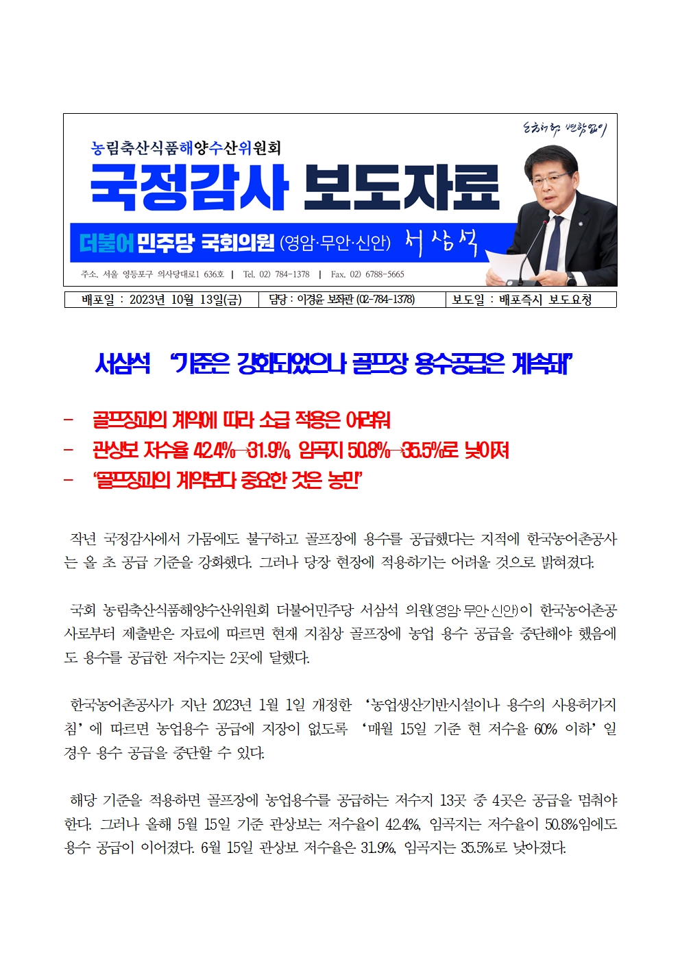 [서삼석 국회의원] 231013_서삼석 “기준은 강화되었으나 골프장 용수공급은 계속돼”