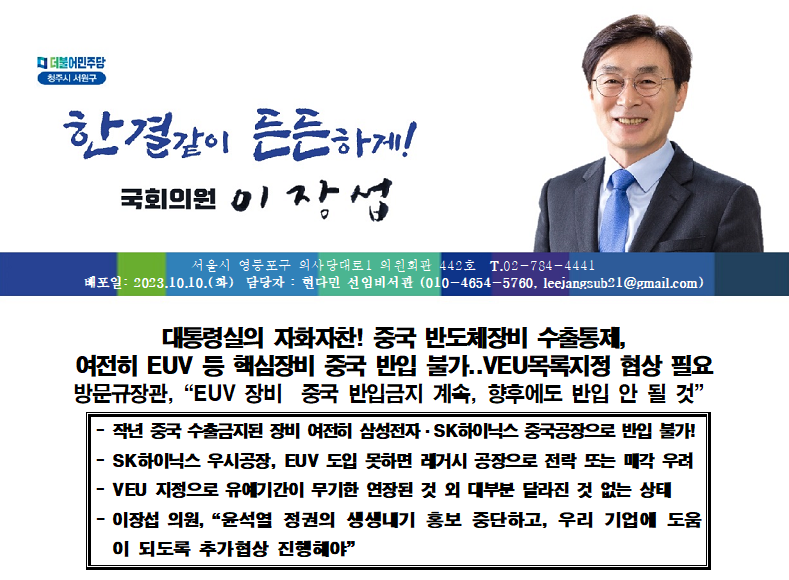 이장섭의원_231010_대통령실의 자화자찬! 중국 반도체장비 수출통제, 여전히 EUV 등 핵심장비 중국 반입 불가