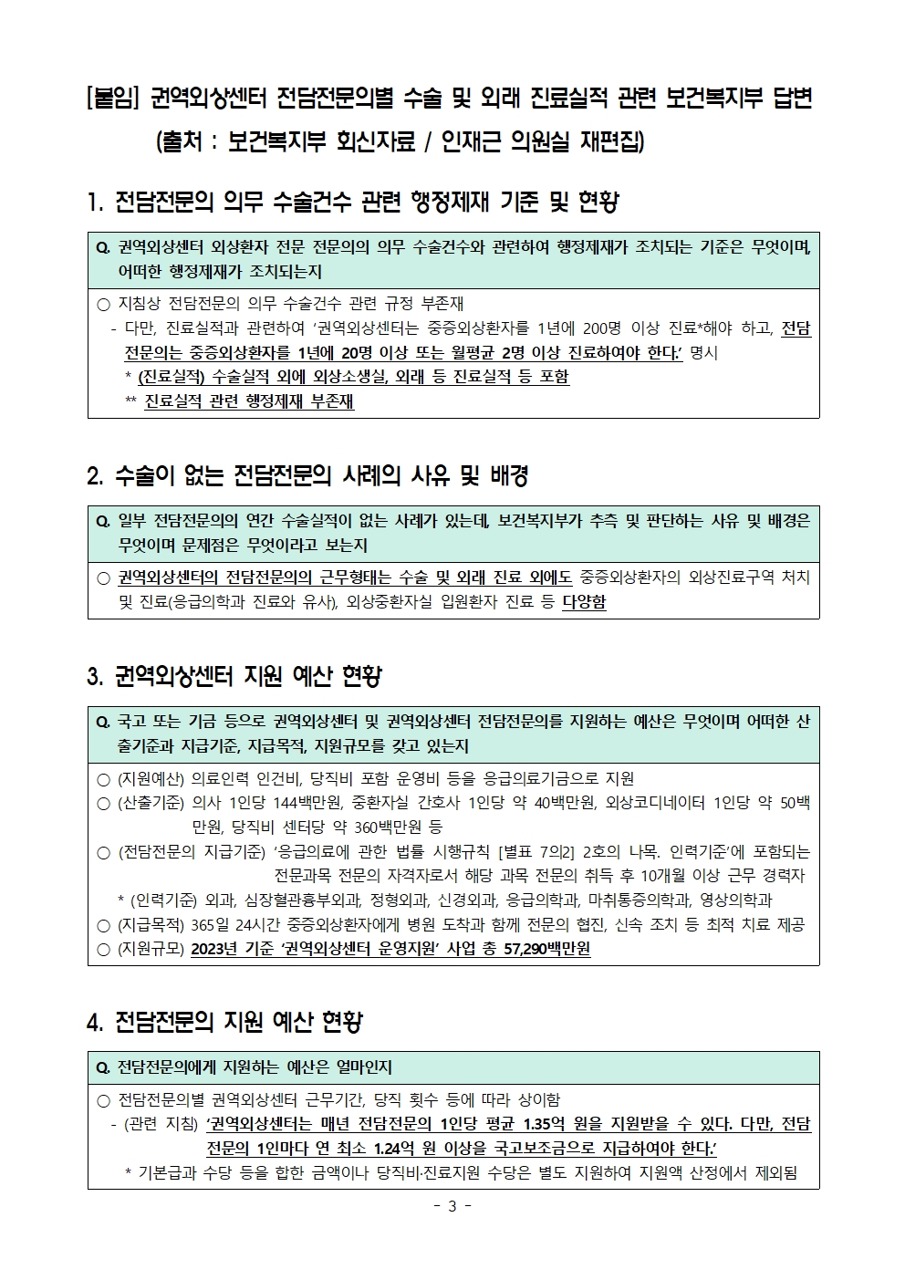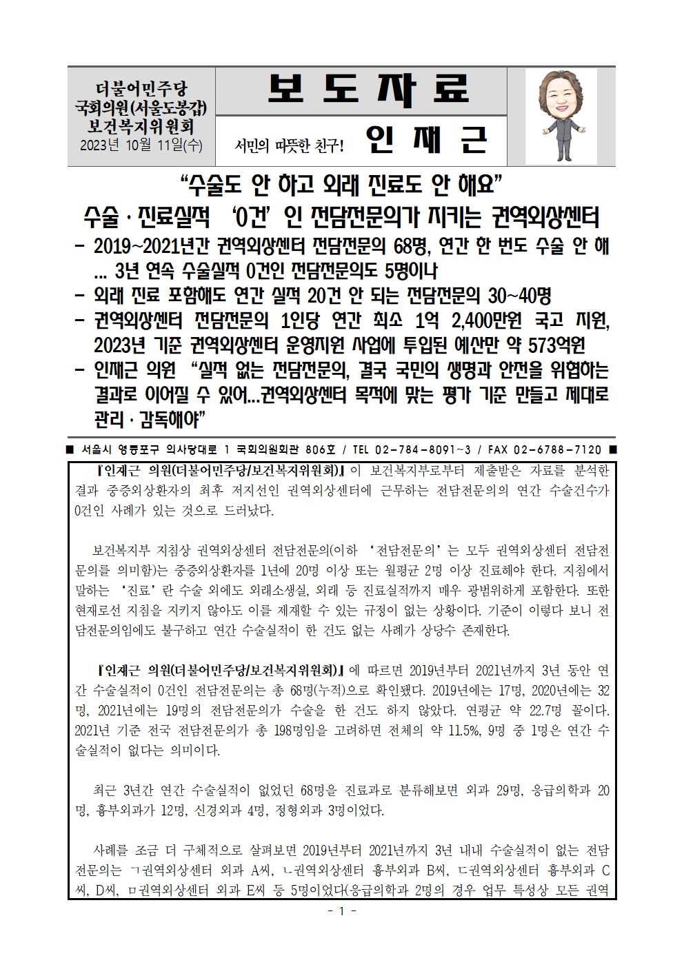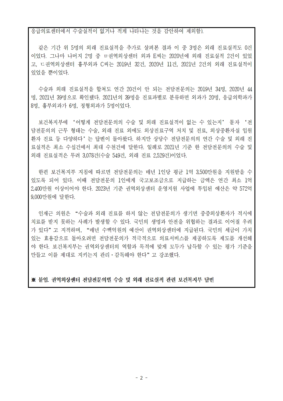 [인재근의원실 보도자료] “수술도 안 하고 외래 진료도 안 해요” 수술·진료실적 ‘0건’인 전담전문의가 지키는 권역외상센터