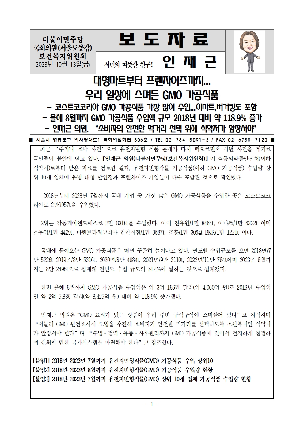 231013_[인재근의원실 보도자료]_대형마트부터 프렌차이즈까지...우리 일상에 스며든 GMO 가공식품.hwp