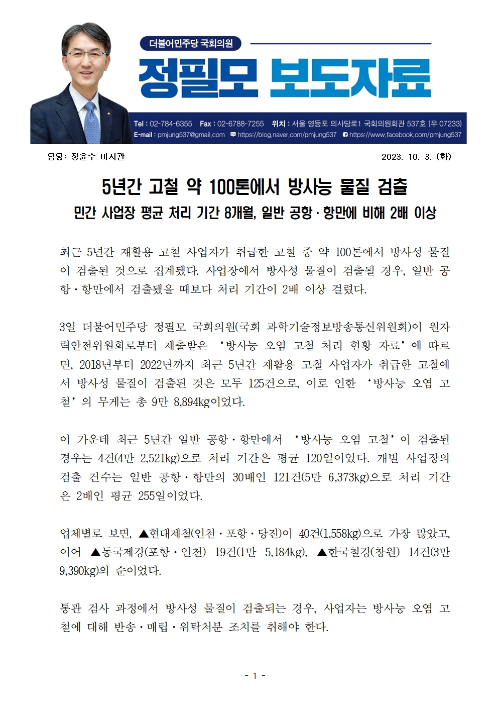 231003_국정감사_보도자료_5년간_고철_약_100톤에서_방사능_물질_검출_정필모의원.hwp
