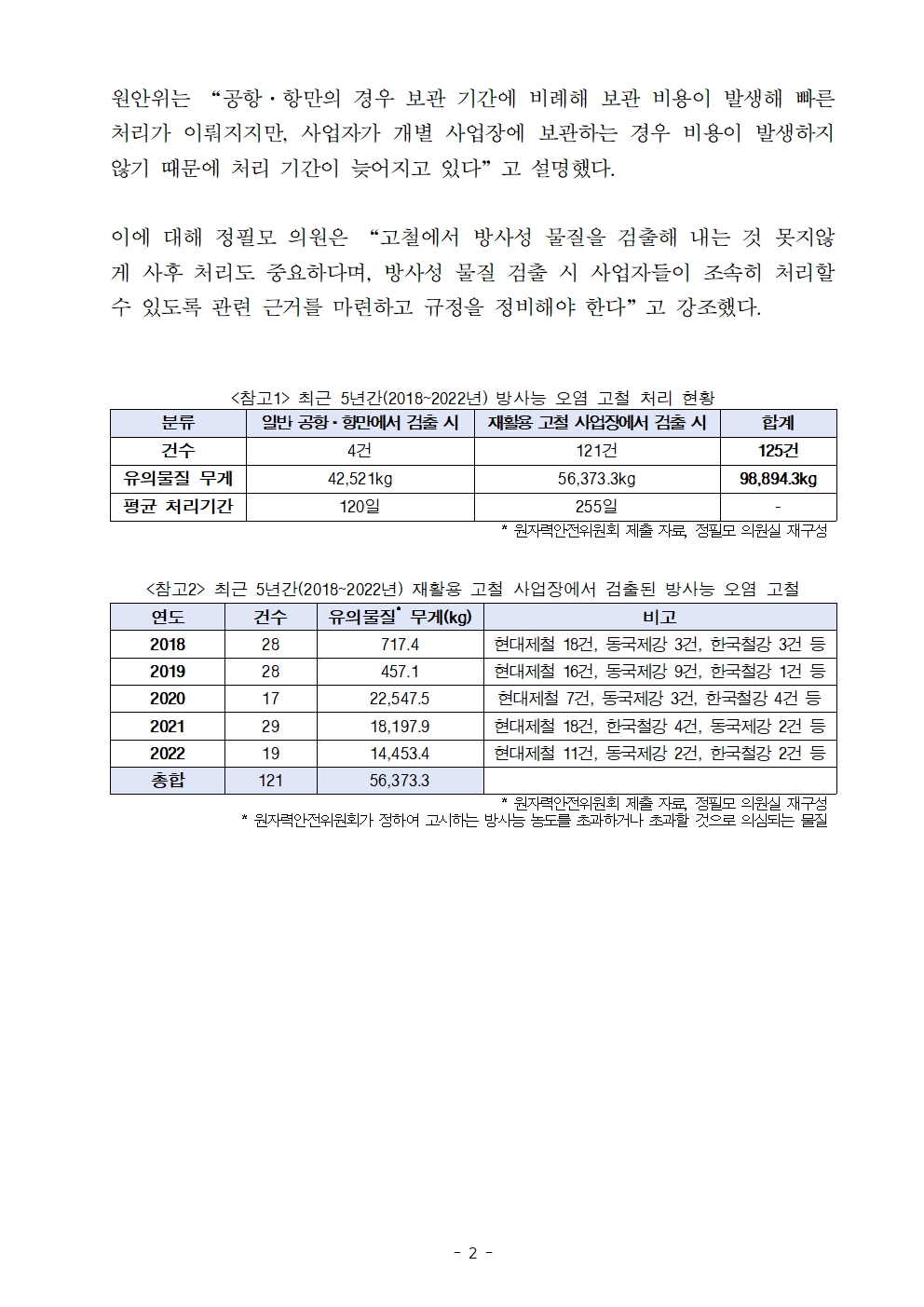 [정필모 의원 보도자료] 5년간 고철 약 100톤에서 방사능 물질 검출