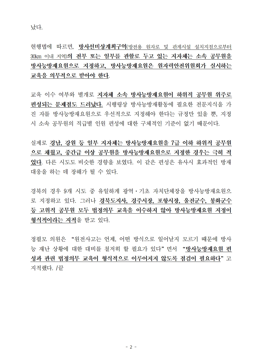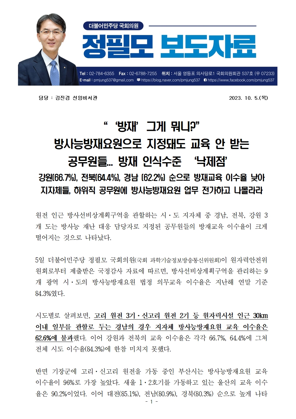 [정필모 의원 보도자료] “‘방재’그게 뭐니?” 방사능방재요원으로 지정돼도 교육 안 받는 공무원들... 방재 인식수준 ‘낙제점’