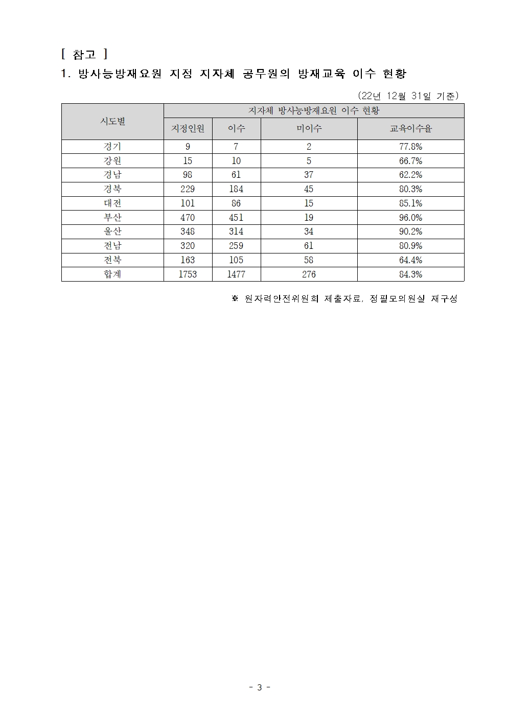 231005_국정감사_보도자료_방사능방재요원으로_지정돼_방재교육_안받는_공무원들_경남_전북_강원_하위권.hwp