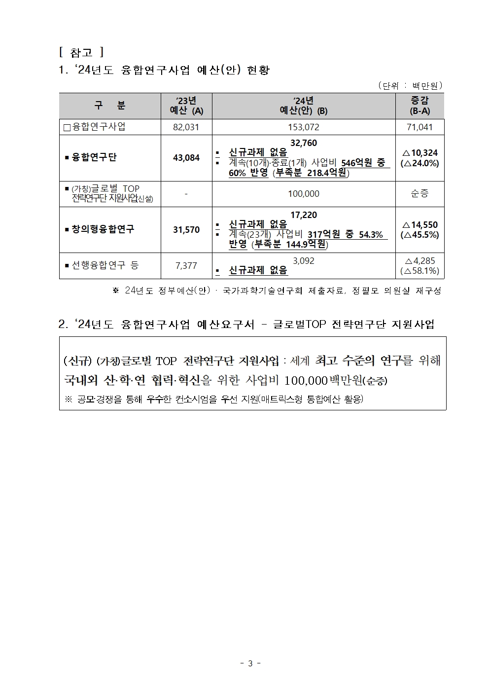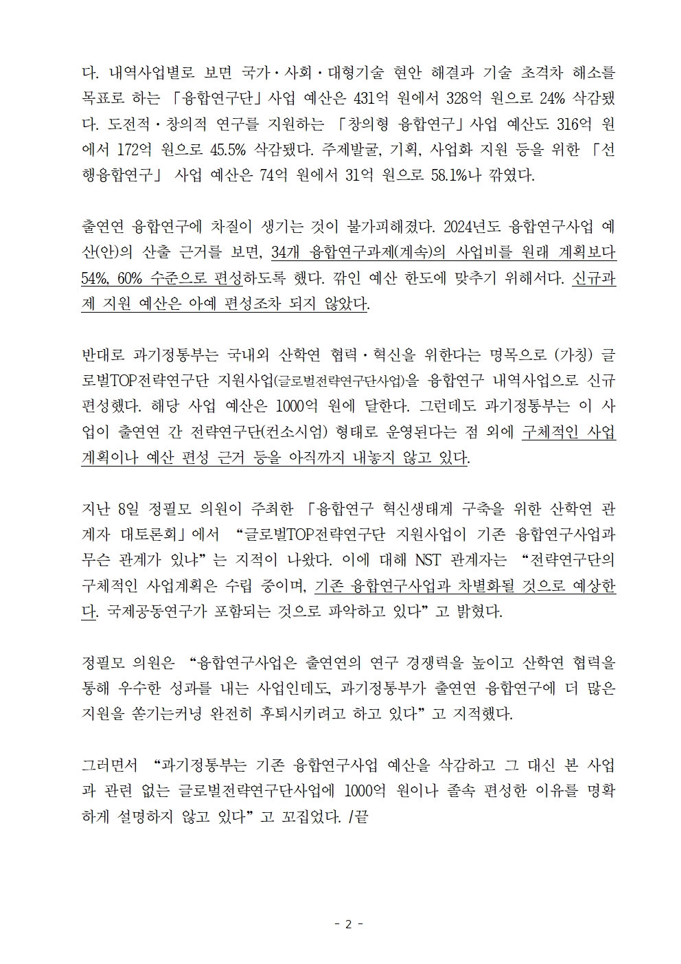 [정필모 의원 보도자료] 융합연구 투자 역행... 출연연 융합연구사업 예산 35.3% 삭감