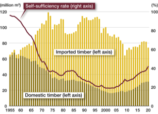 실제 일본에서는 2010년부터 공공 건축물 등에서의 목재의 이용 촉진에 관한 법률을 제정한 이후, 일본 정부가 정비한 저층 건축물의 목조화율이 90.6%를 기록하는 등 목조건축과 국산 목재 사용이 활발해졌고, 이에 2011년 이후 목재 자급률이 지속적으로 상승하여 1972년 이후 48년 만에 처음으로 2020년 목재 자급률 41.8%를 기록했다.