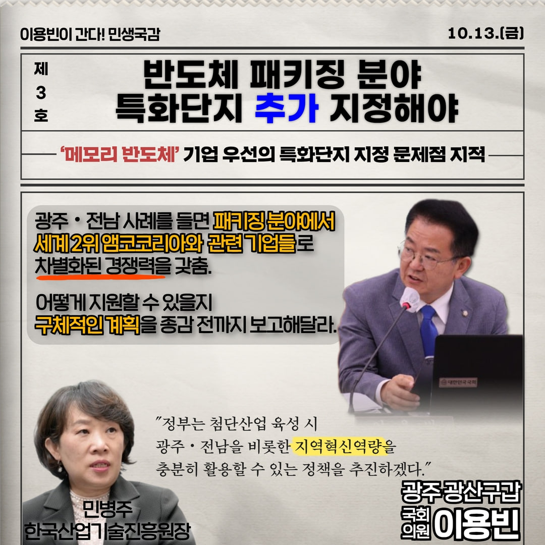 오늘 국감에서 ‘시스템 반도체 패키징’분야 특화단지 추가 지정을 촉구했습니다.