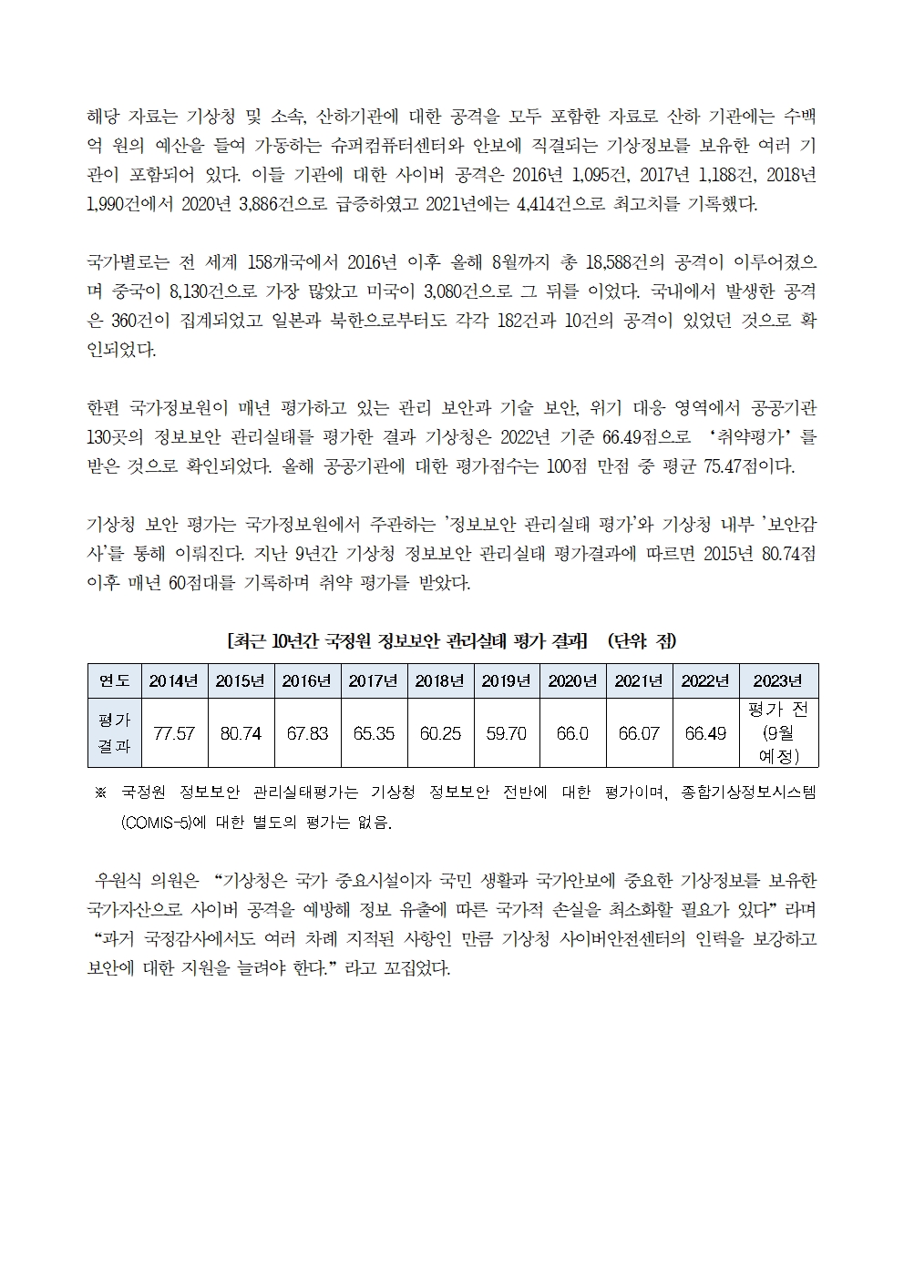 [우원식 의원 보도자료]600억 넘는 슈퍼컴퓨터 보유 ‘기상청’ 겨냥한 사이버 공격 6년간 4배 증가…국정원 정보보안 관리실태 평가도 7년 연속 하위권