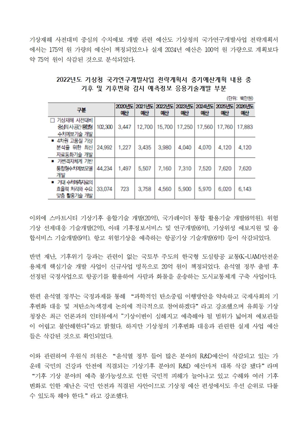 [우원식 의원 보도자료] 극한폭우, 가뭄 등 여러 기후 재난에도 기상청 R&D예산, 212억 원 삭감