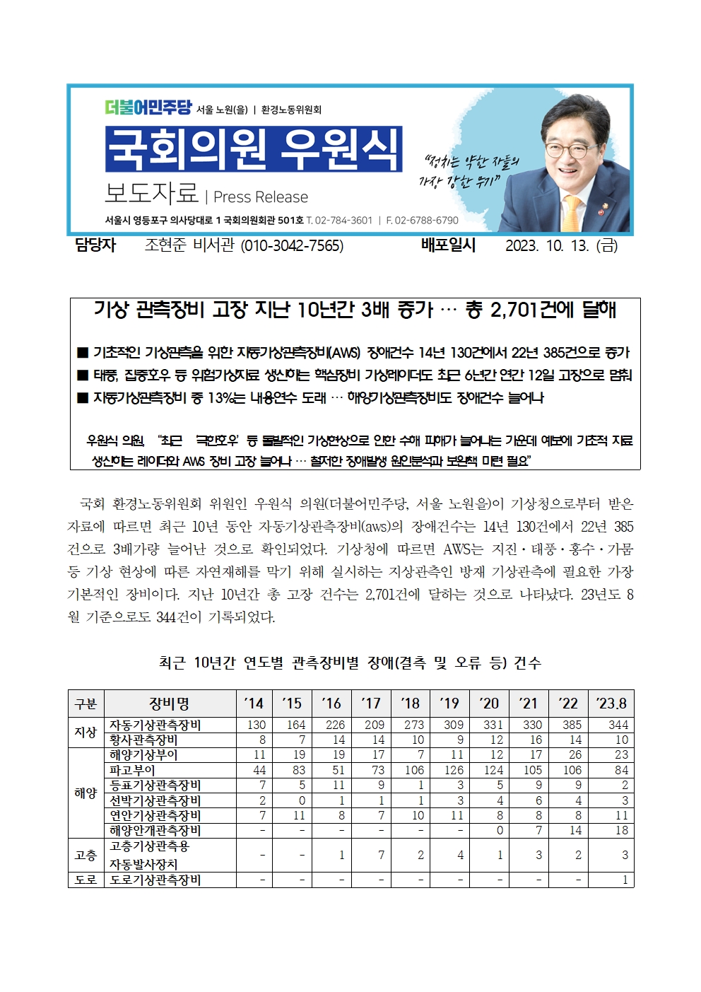 [우원식 의원 보도자료] 기상 관측장비 고장 지난 10년간 3배 증가 … 총 2,701건에 달해