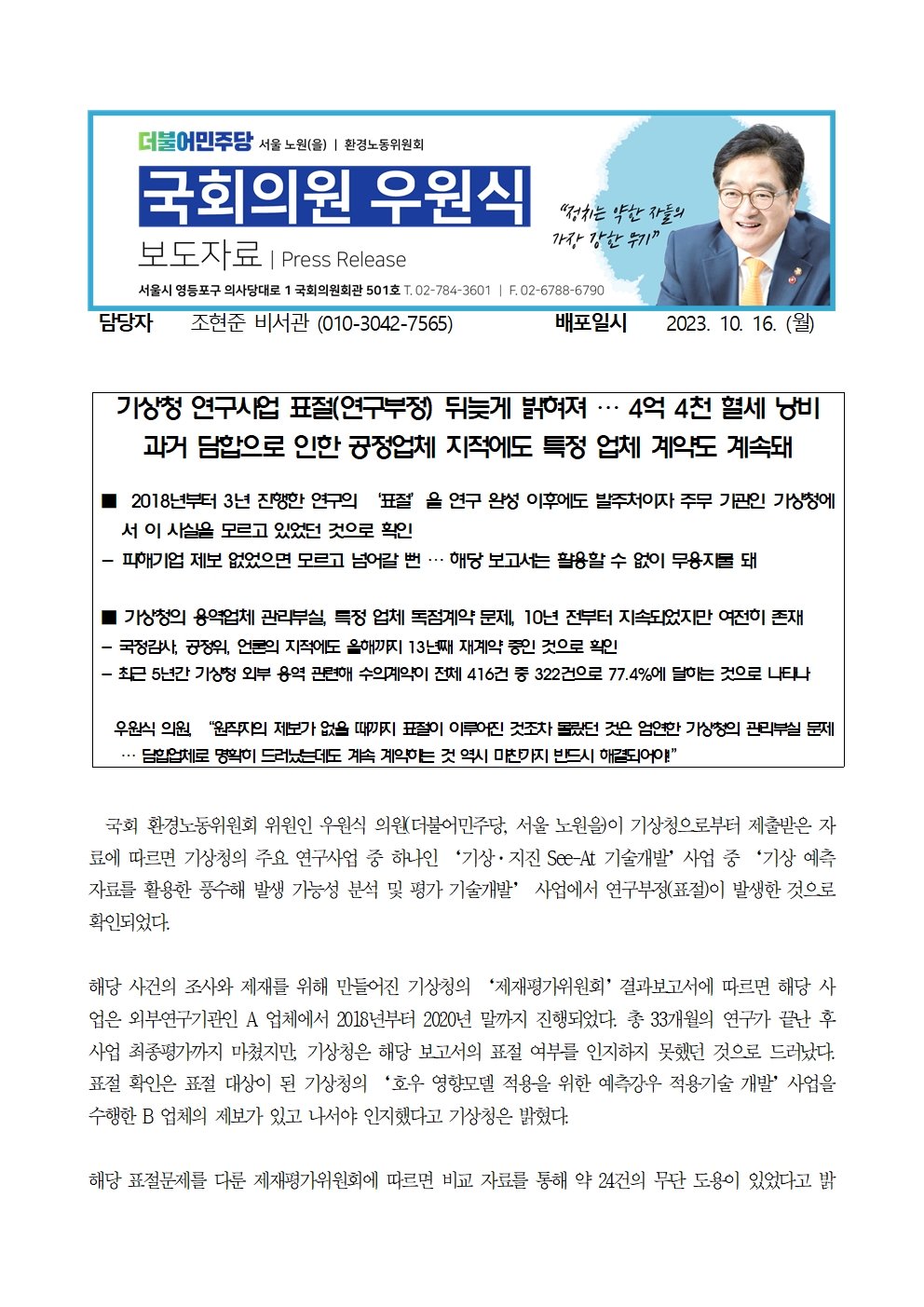 우원식보도자료_기상청_연구부정표절_뒤늦게밝혀져_담합업체_계약도_지속돼_배포본.hwp