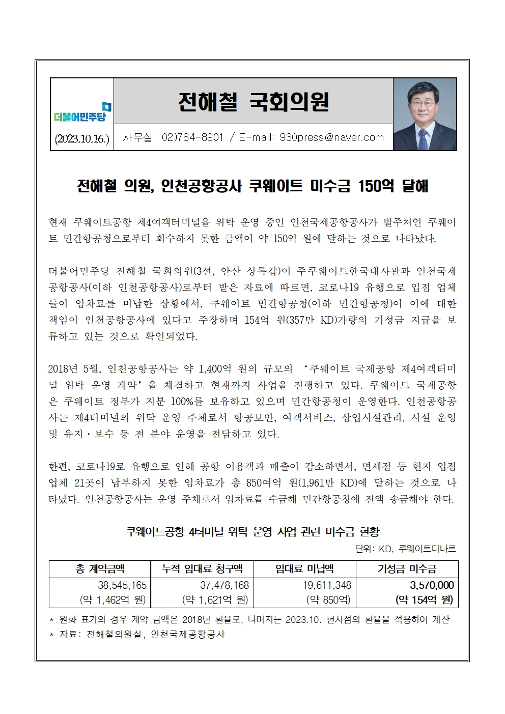 [전해철의원실보도자료]전해철 의원 인천공항공사 쿠웨이트 미수금 150억 달해(2023.10.16.).hwp