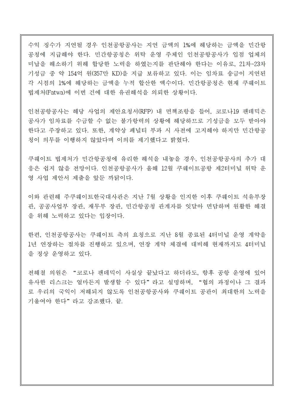 [전해철의원 보도자료] 인천공항공사 쿠웨이트 미수금 150억 달해
