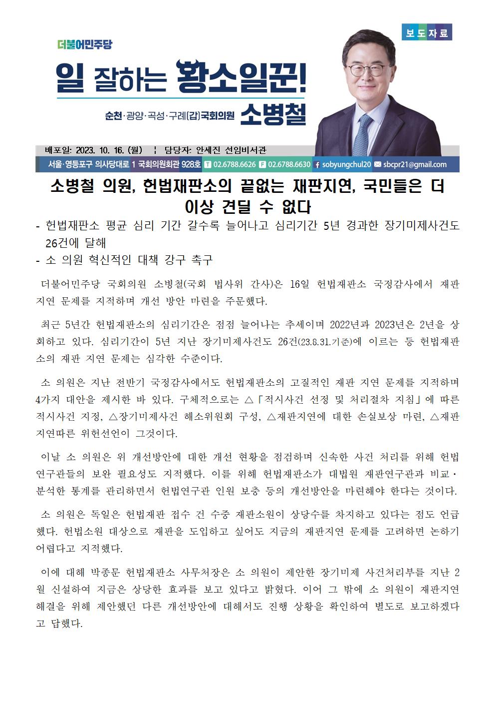 [소병철의원 국감 보도] 소병철 의원, 헌법재판소의 끝없는 재판지연, 국민들은 더 이상 견딜 수 없다