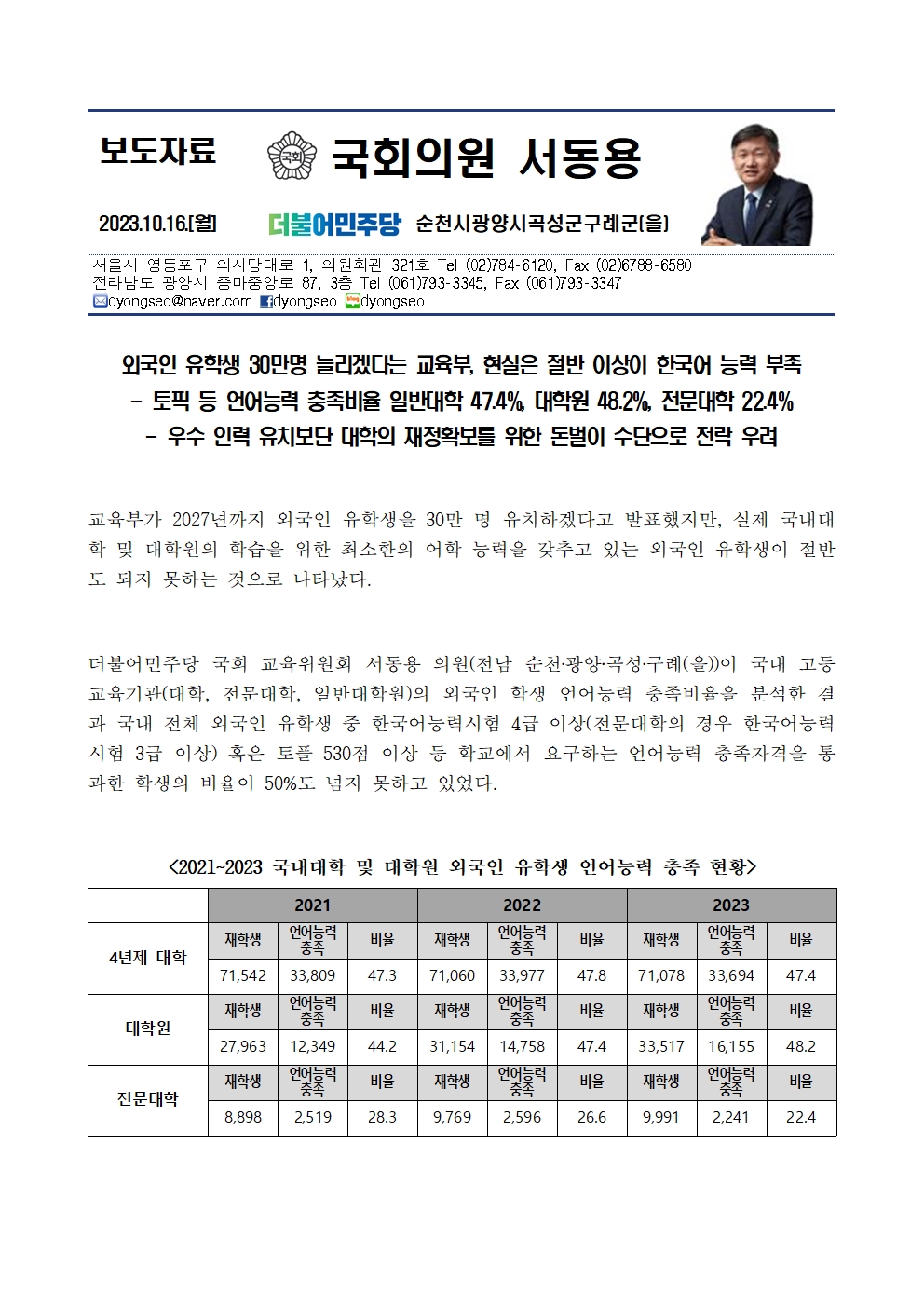 [서동용 의원] 외국인 유학생 30만명 늘리겠다는 교육부, 현실은 절반 이상이 한국어 능력 부족