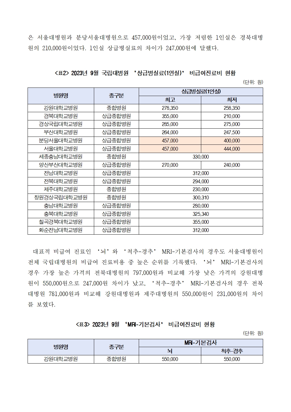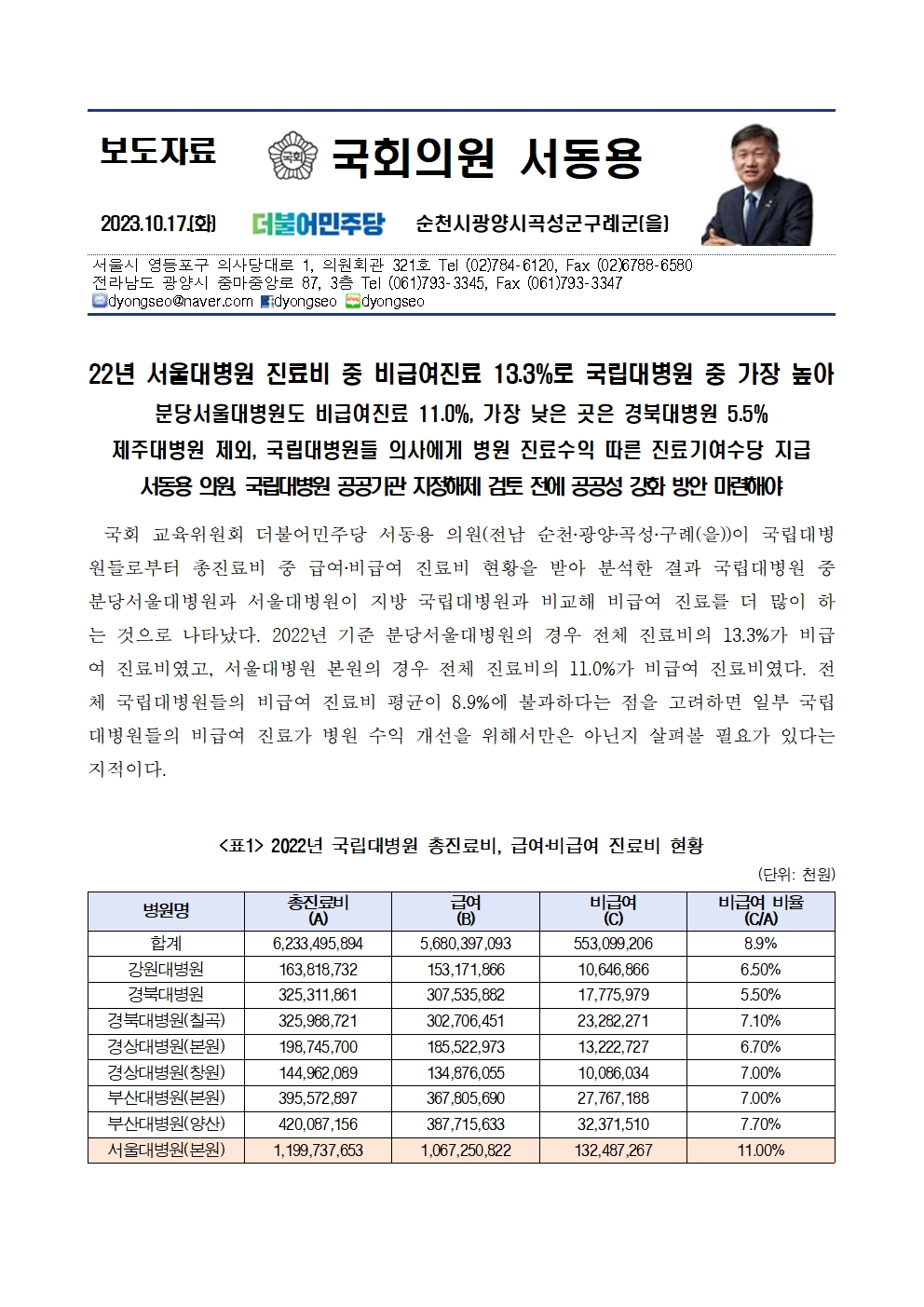[서동용 의원] 22년 서울대병원 진료비 중 비급여진료 13.3%로 국립대병원 중 가장 높아