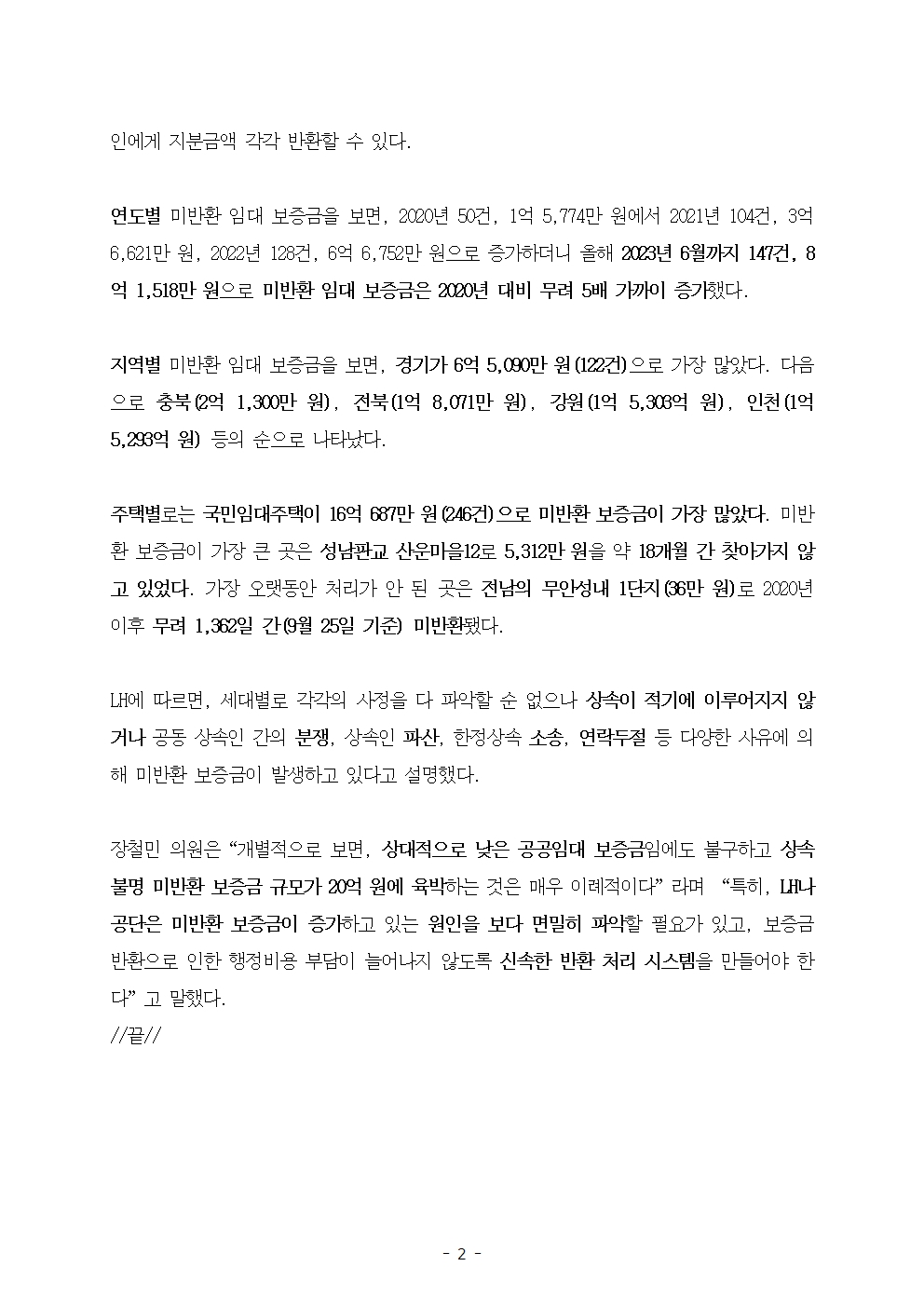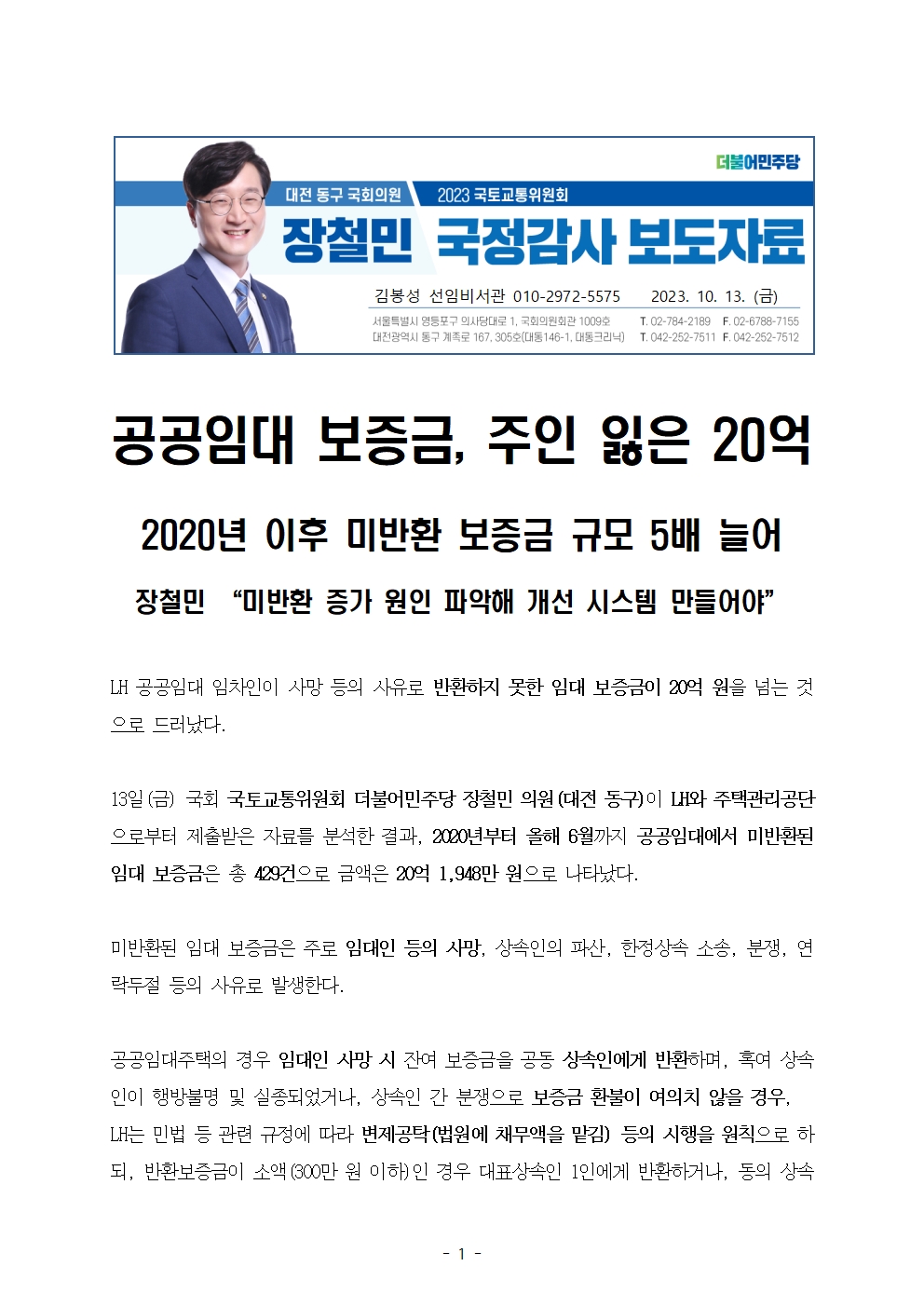 [국회의원 장철민 보도자료] 공공임대 보증금, 주인 잃은 20억