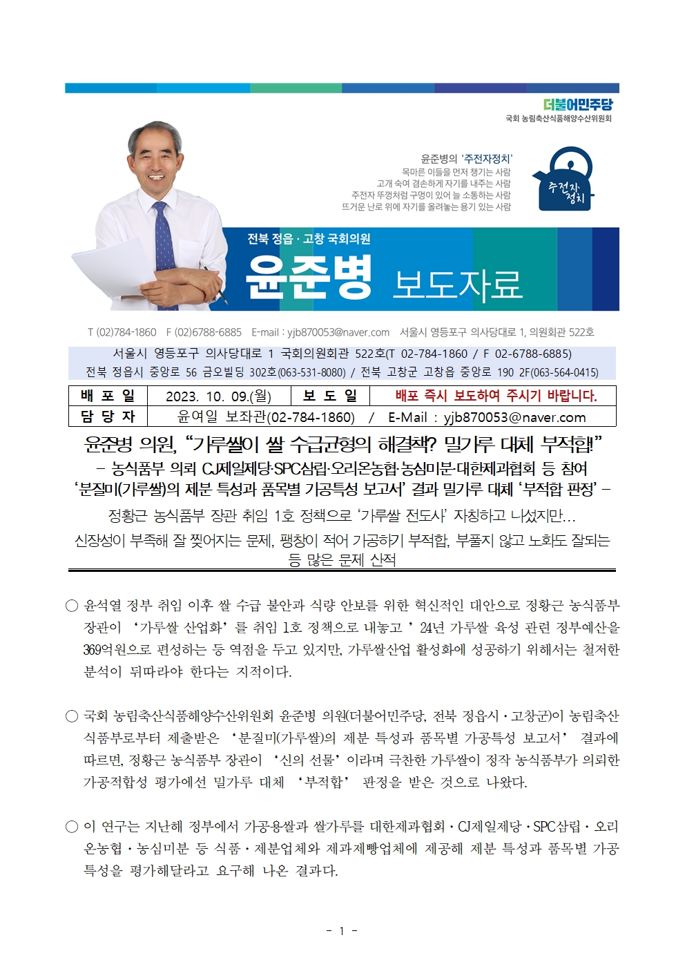 231009 [윤준병 의원 국정감사 보도자료] 윤준병 의원 “가루쌀이 쌀 수급균형의 해결책 밀가루 대체 부적합!”.hwp