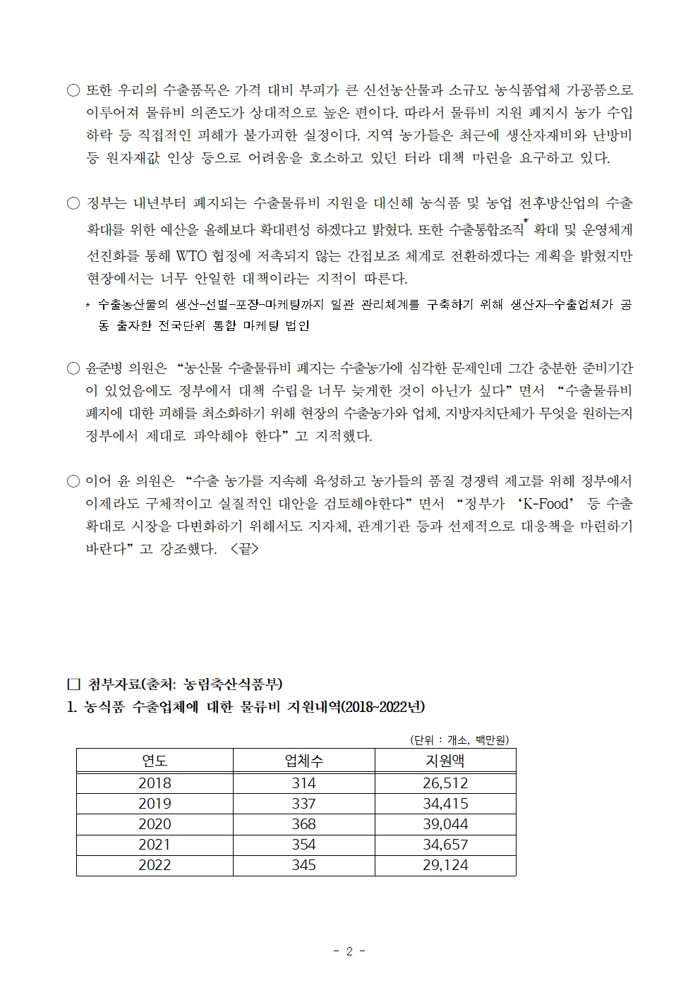 [윤준병 의원 국정감사 보도자료] 윤준병 의원, 농산물 수출물류비 폐지에 대해 정부에 실질적 대책 마련 촉구!