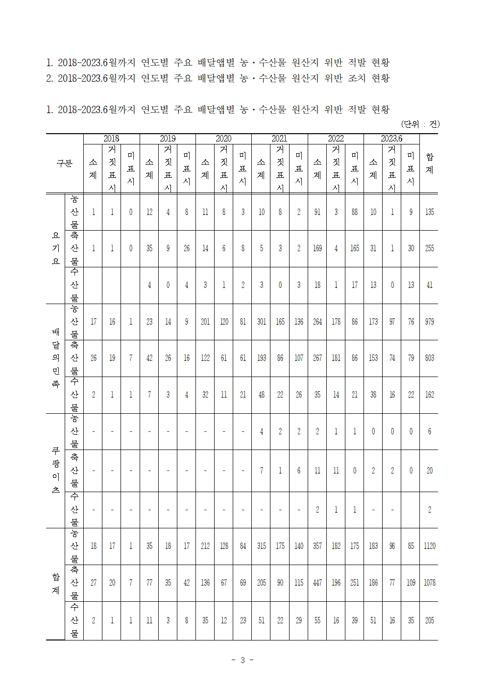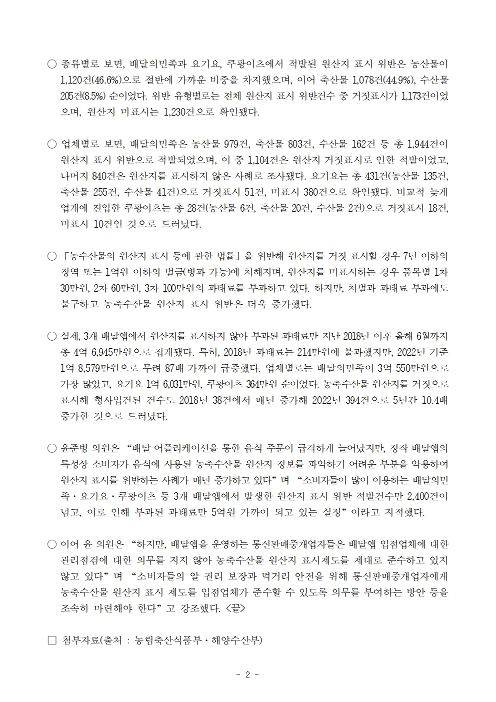 [윤준병 의원 국정감사 보도자료] 윤준병 의원, 3개 주요 배달앱 농축수산물 원산지 위반 2,400건, 과태료만 5억원!