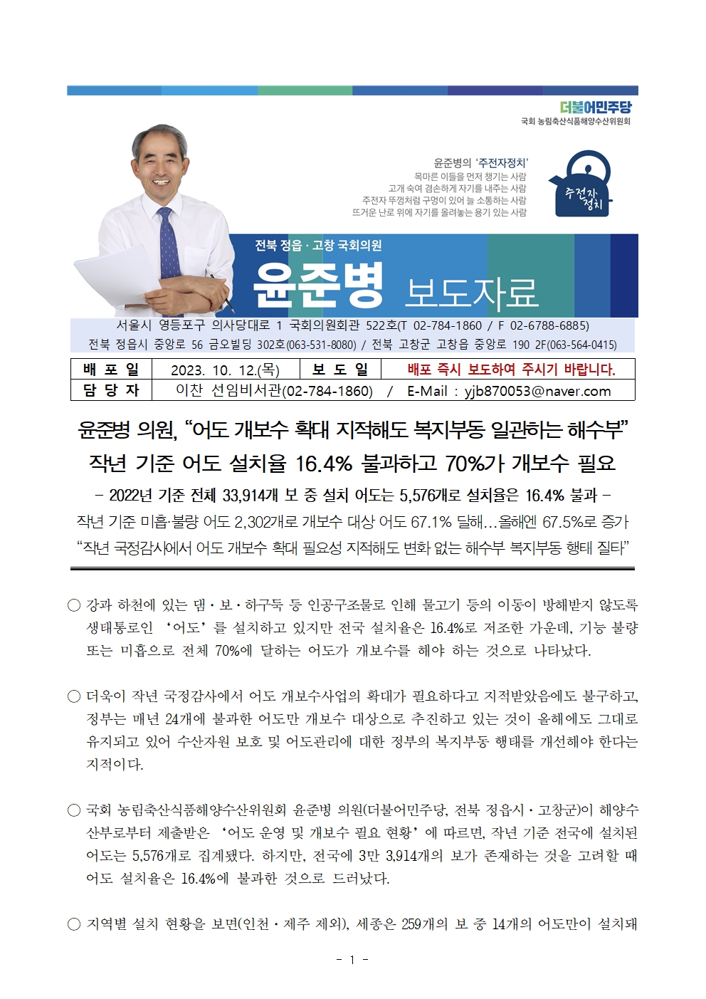 231012 [윤준병 의원 국정감사 보도자료] 윤준병 의원 작년 기준 어도 설치율 16.4% 불과하고 70%가 개보수 필요.hwp