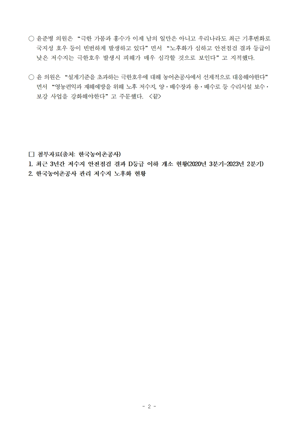 [윤준병 의원 국정감사 보도자료] 윤준병 의원, 농어촌공사 관리 저수지 극한호우 대비 설계기준 강화 필요!