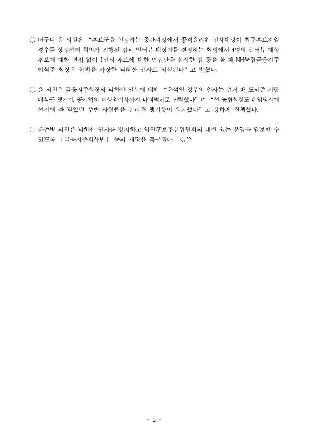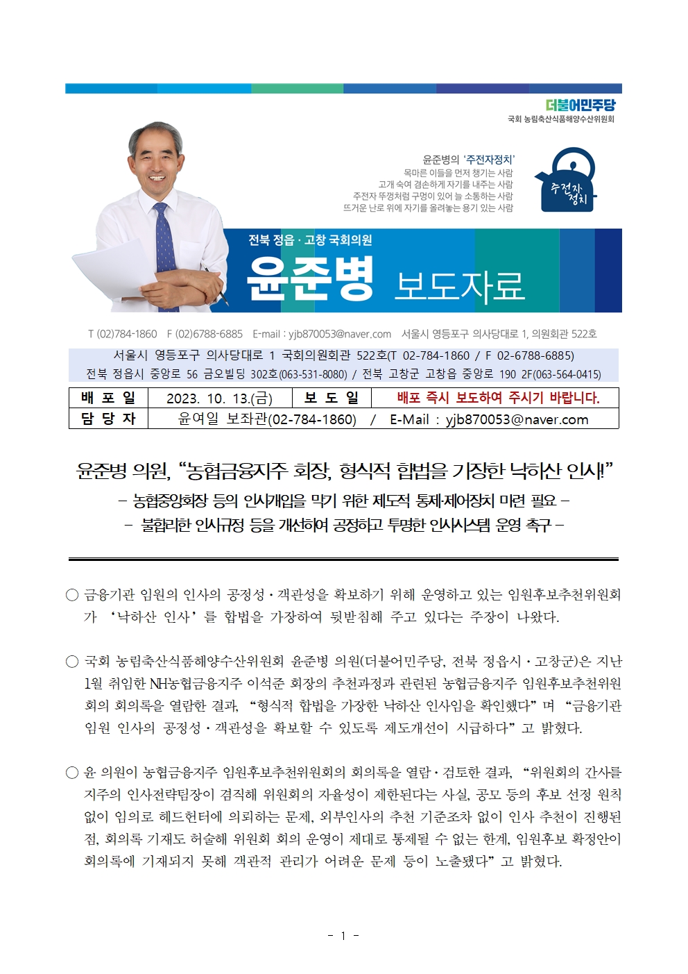 231013 [윤준병 의원 국정감사 보도자료] 윤준병 의원_ “농협금융지주 회장_ 형식적 합법을 가장한 낙하산 인사!”.hwp