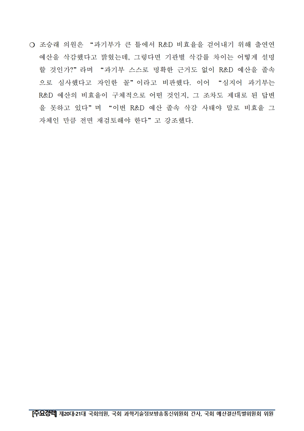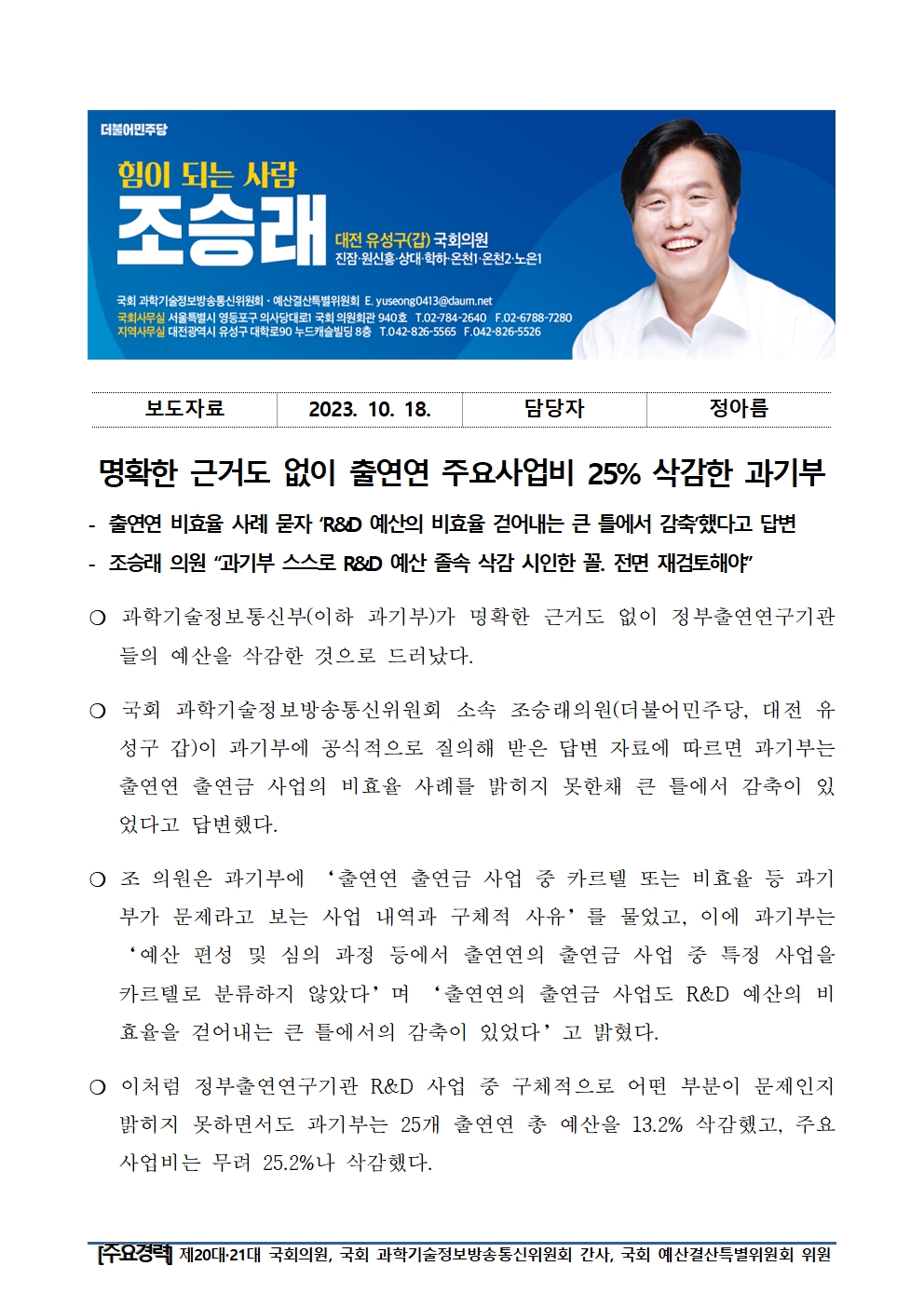 [조승래의원 보도자료] 명확한 근거도 없이 출연연 주요사업비 25% 삭감한 과기부