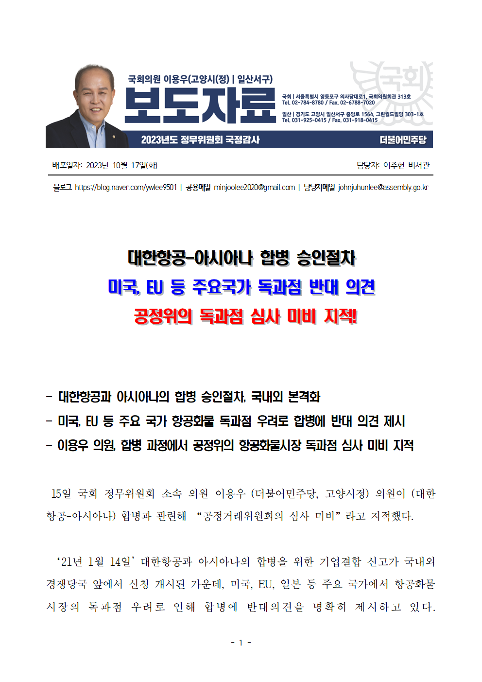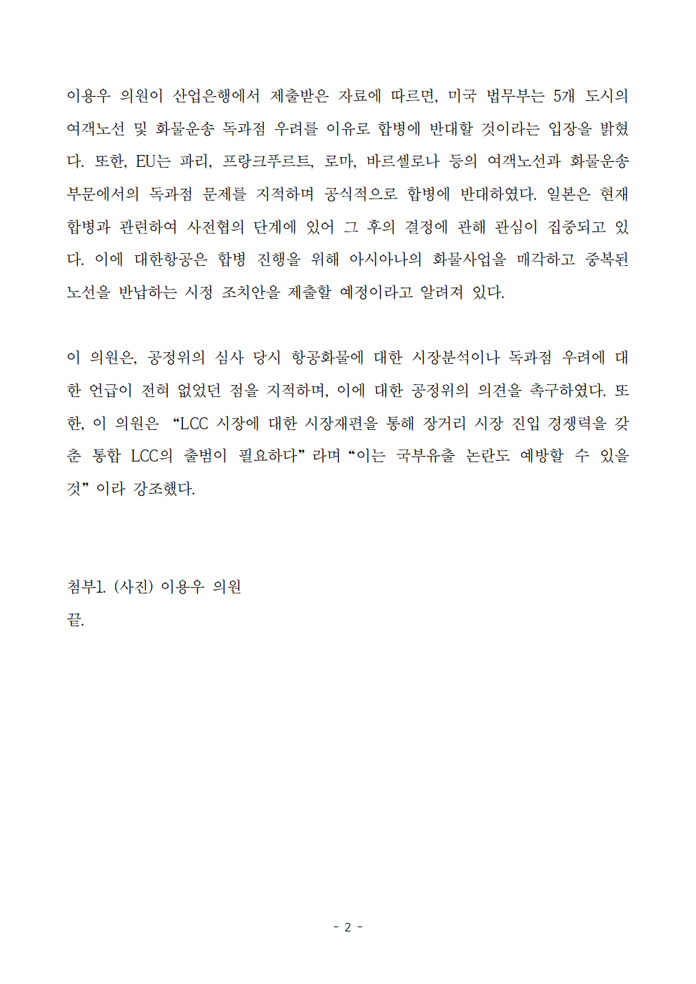 [이용우 의원] 대한항공-아시아나 합병 승인절차 미국, EU 등 주요국가 독과점 반대 의견 공정위의 독과점 심사 미비 지적!