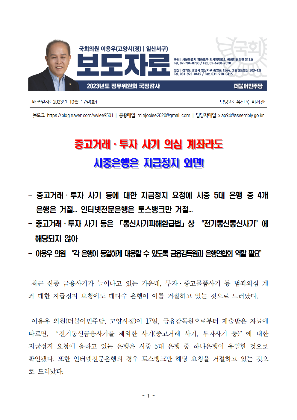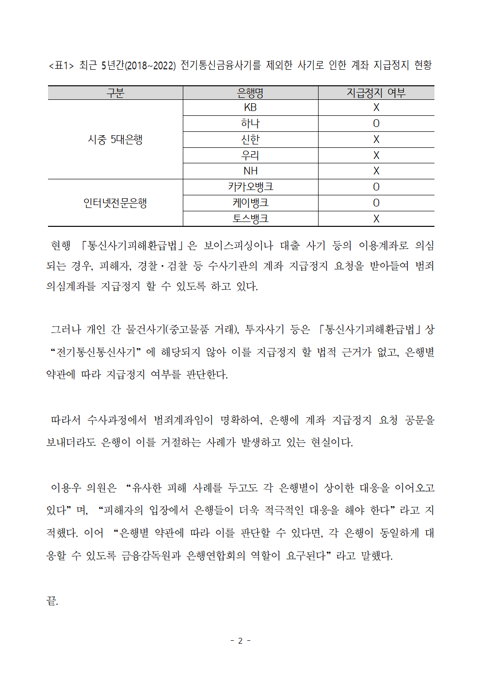 [이용우 의원] 중고거래·투자 사기 의심 계좌라도 시중은행은 지급정지 외면!