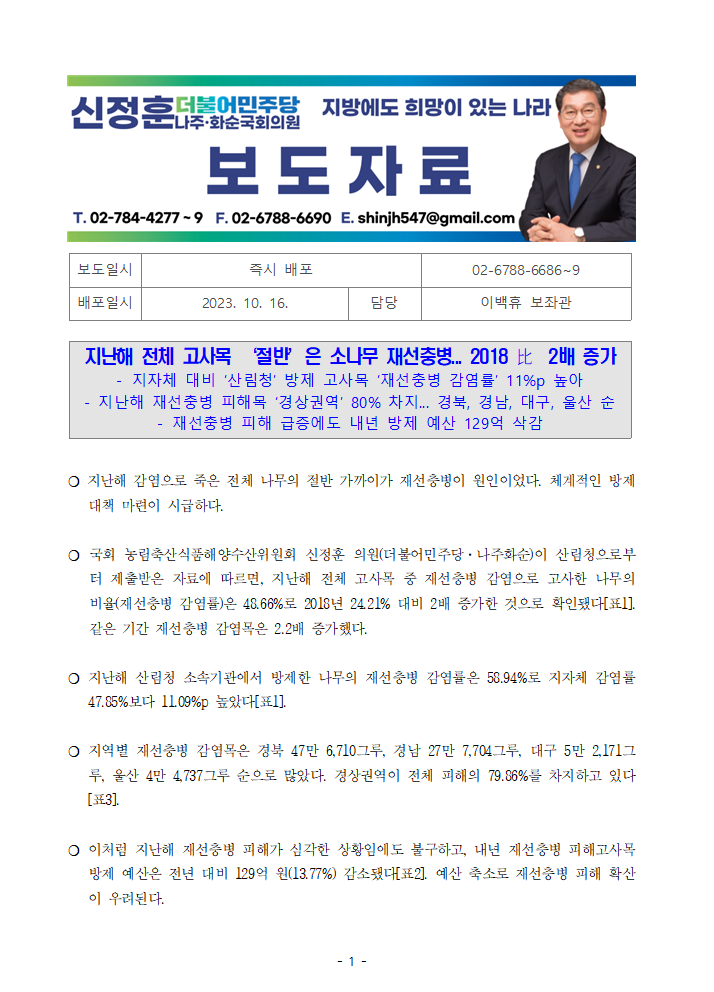 [신정훈 의원 보도자료] 지난해 전체 고사목 ‘절반’은 소나무 재선충병... 2018 比 2배 증가