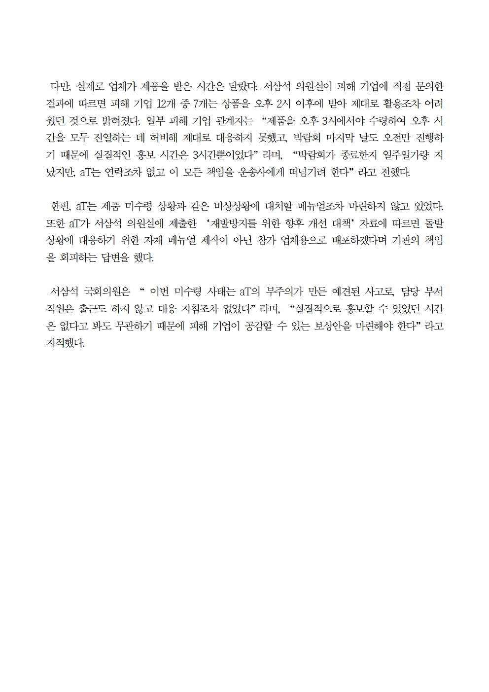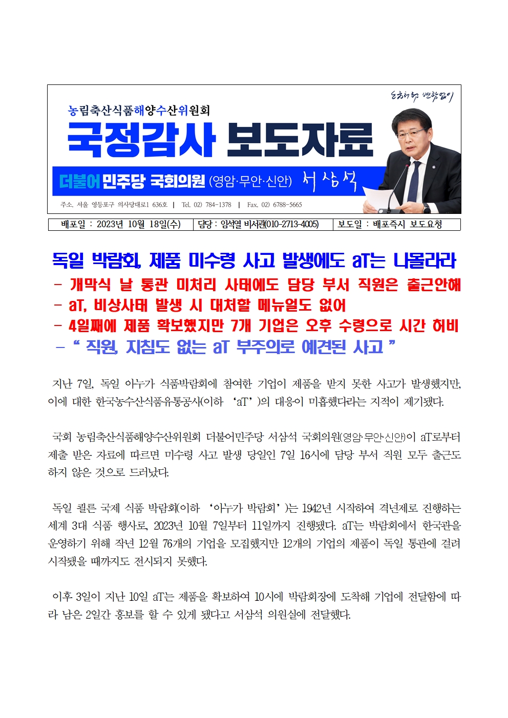231018_[서삼석 국회의원] 독일 박람회 제품 미수령 사고 발생에도 aT는 나몰라라.hwp