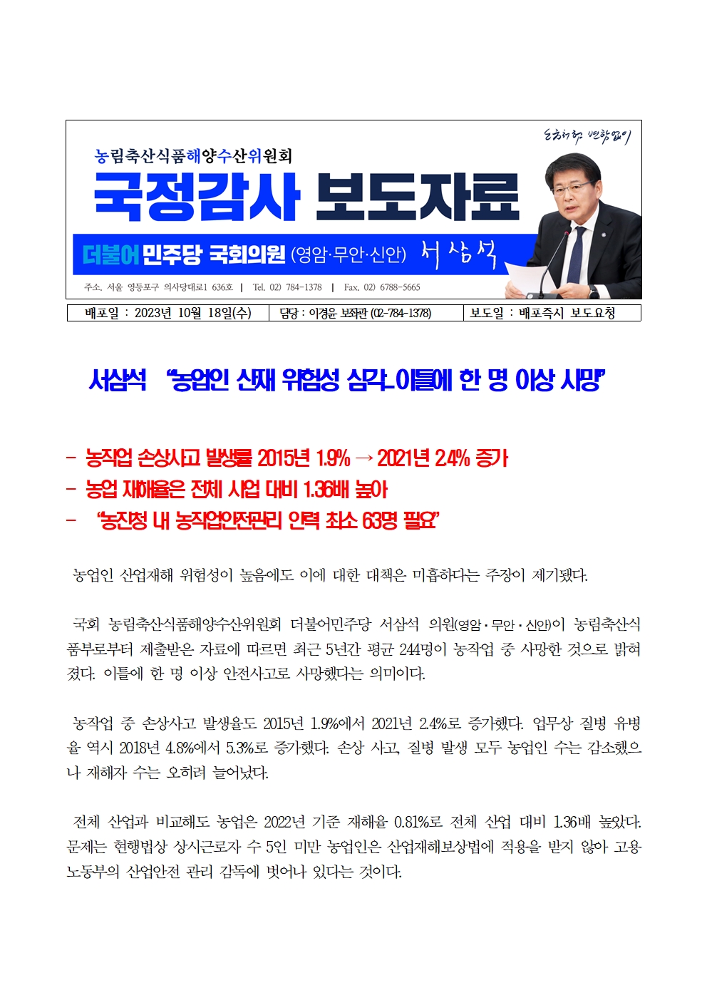 231018_[서삼석 국회의원] 서삼석 “농업인 산재 위험성 심각...이틀에 한 명 이상 사망”.hwp