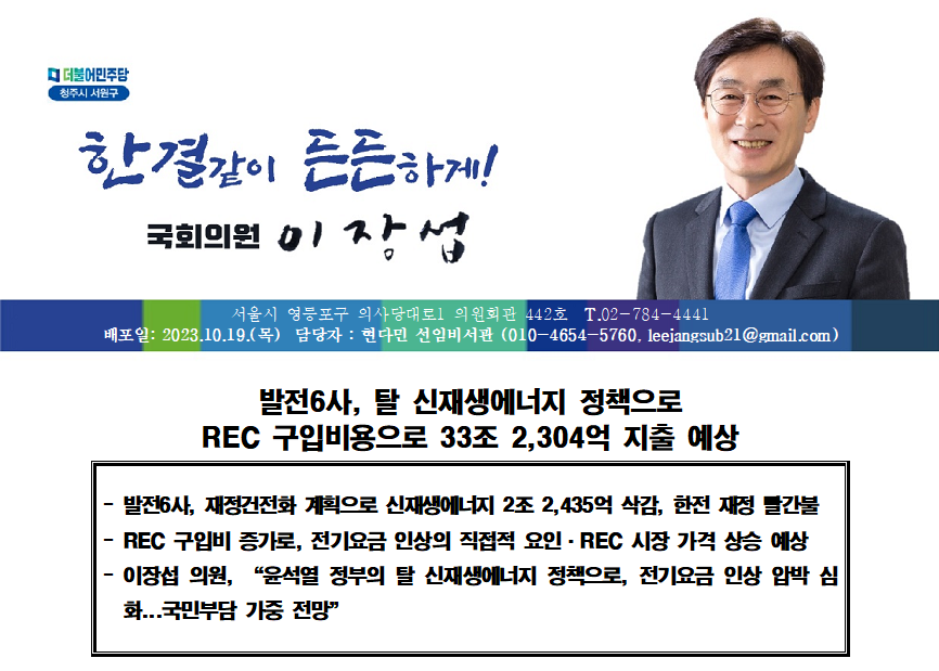 이장섭의원_231019_발전6사, 탈 신재생에너지 정책으로 REC 구입비용으로 33조 2,304억 지출 예상