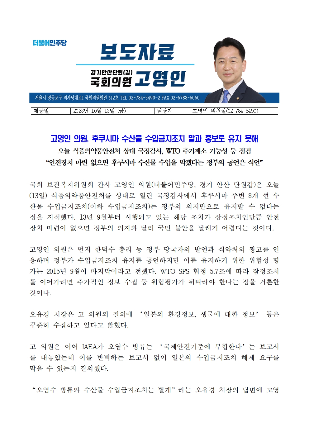 [국정감사 보도자료] 고영인 의원, 후쿠시마 수산물 수입금지조치 말과 홍보로 유지 못해