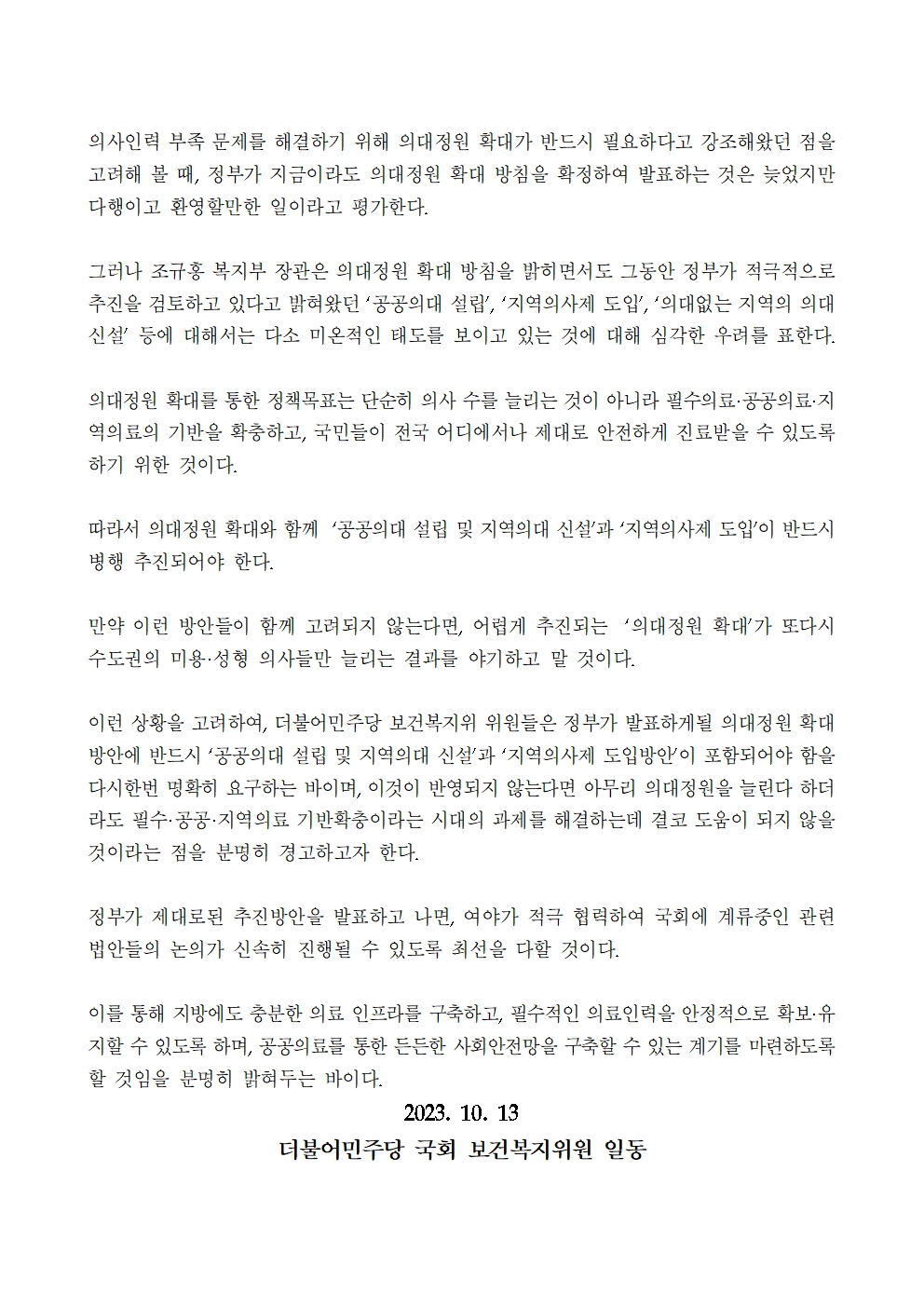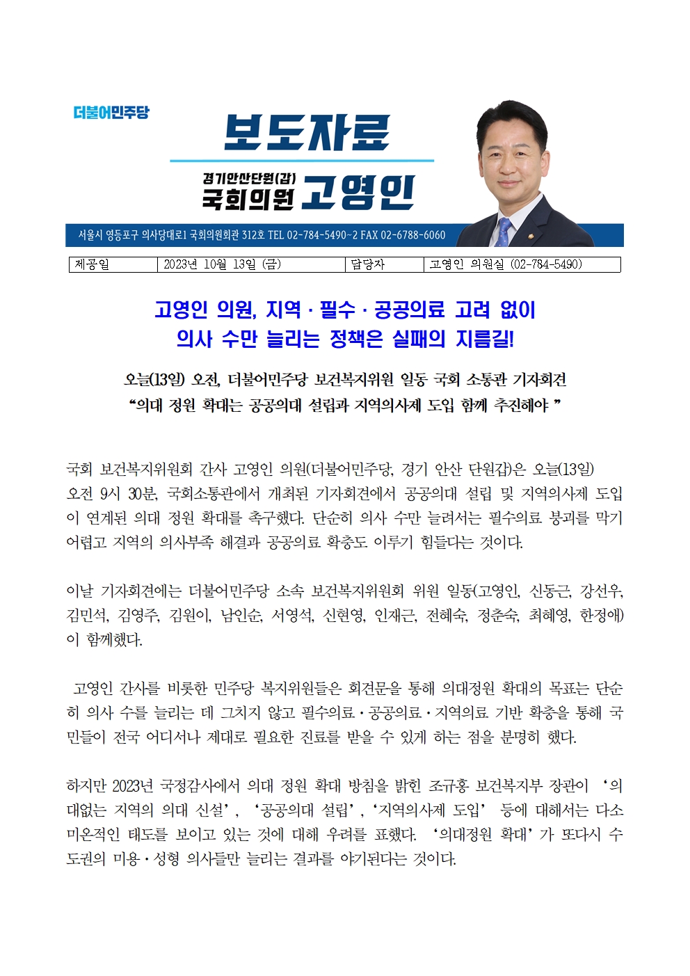 2023_1013_보도자료_고영인_의원__지역·필수·공공의료_고려_없이_의사수만_늘리는_정책은_실패의_지름길_수정.hwp