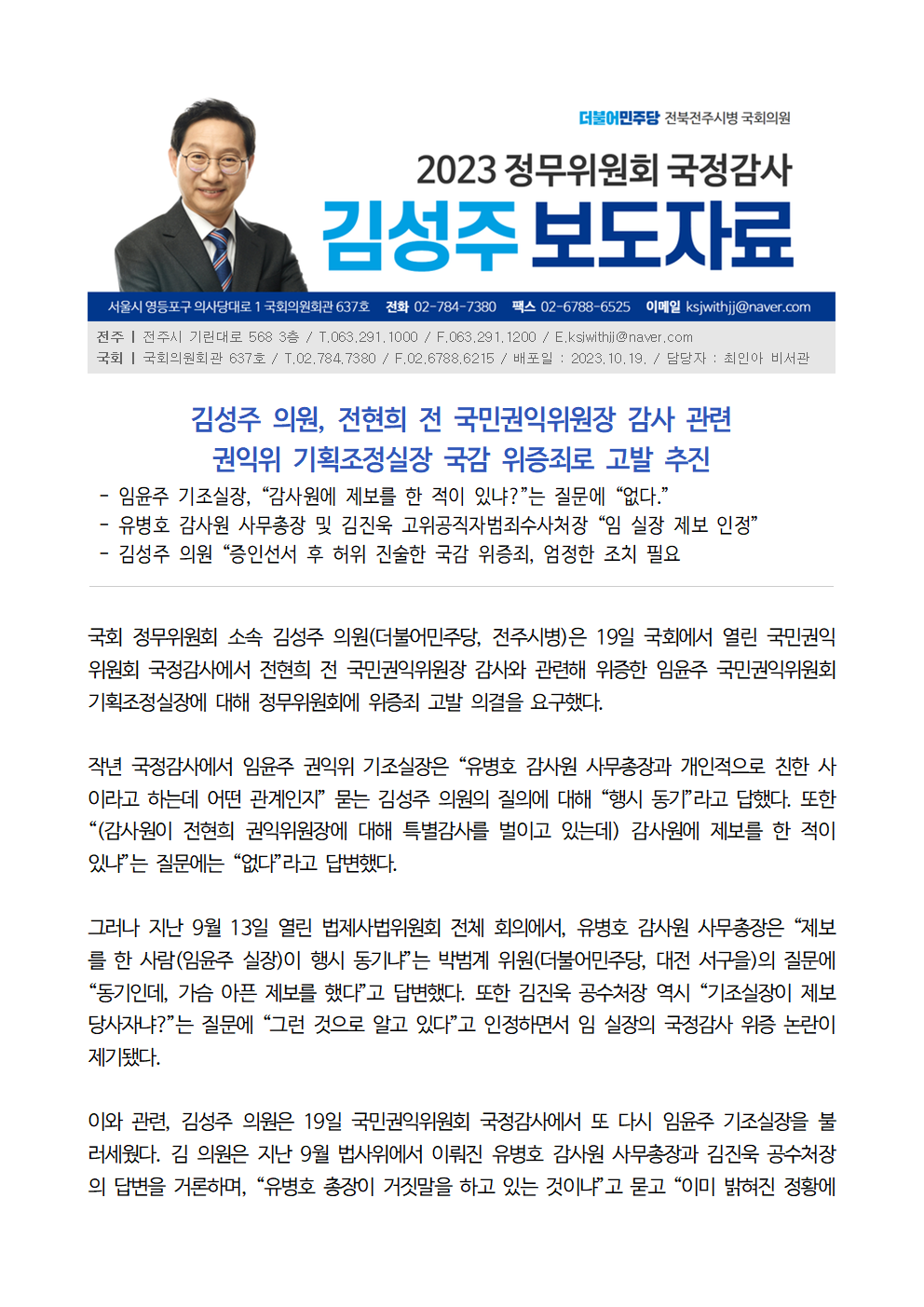 [김성주의원 보도자료] 전현희 전 국민권익위원장 감사 관련 임윤주 기조실장 위증죄 고발해야