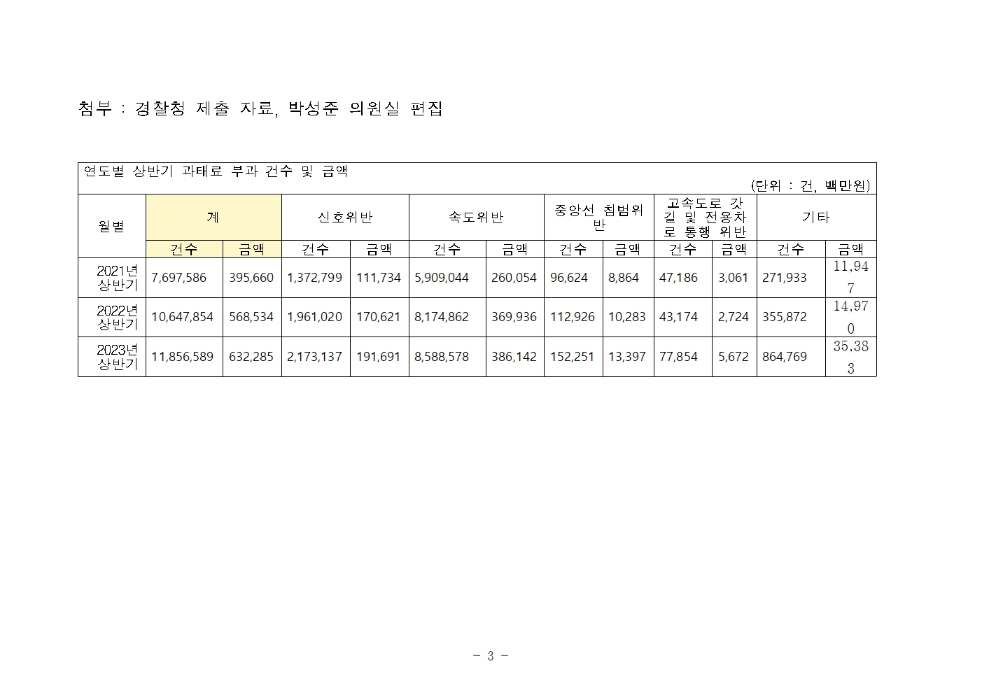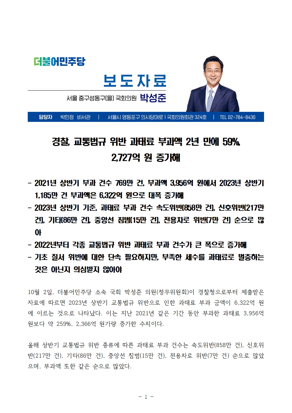 [국회의원 박성준_보도자료]231003_경찰교통법규 위반 과태료 부과액 2년 만에 59% 2727억원 증가해.hwp