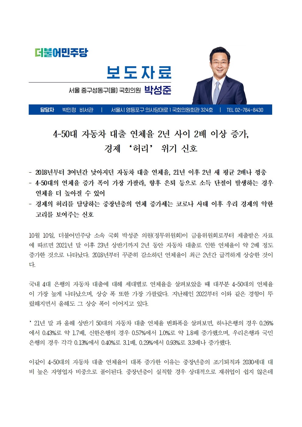 [국회의원 박성준_보도자료]231010_4-50대 자동차 대출 연체율 2년 사이 2배 이상 증가경제 ‘허리’ 위기 신호.hwpx