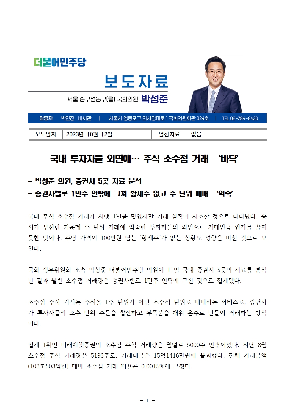 [국회의원 박성준_보도자료]231012_국내 투자자들 외면에 주식 소수점 거래 바닥.hwp