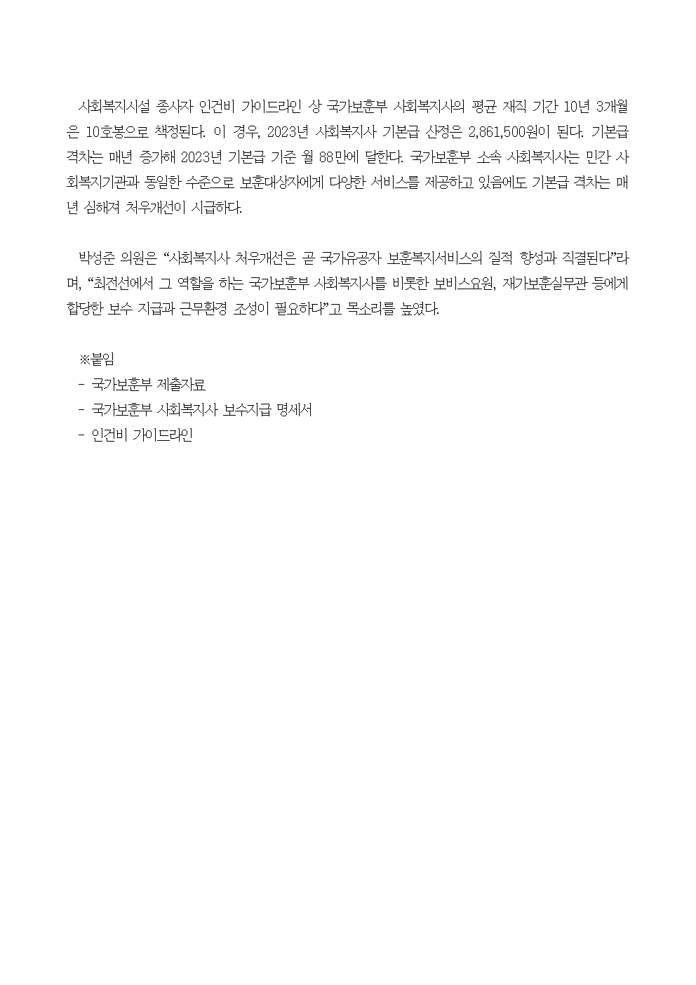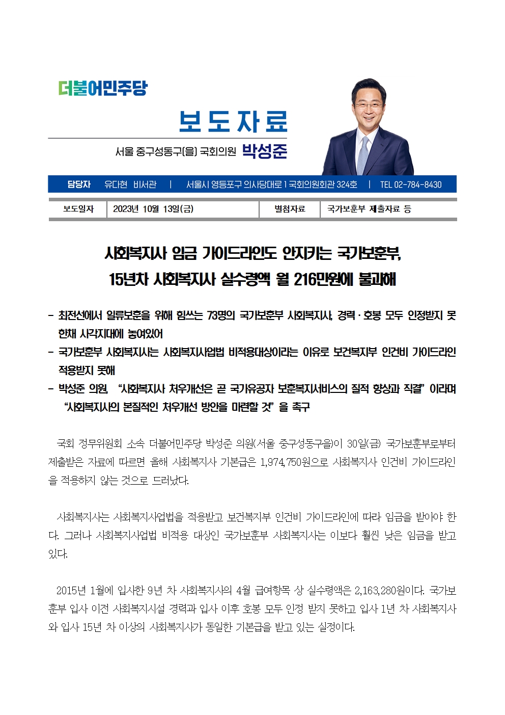 [국회의원 박성준_보도자료]231013_사회복지사 임금 가이드라인도 안지키는 국가보훈부.hwp